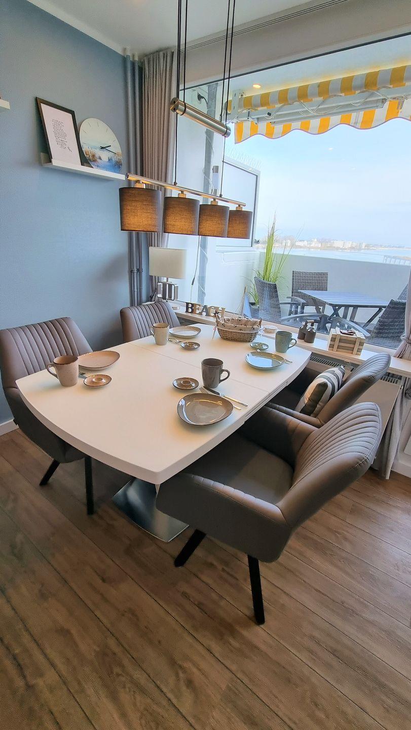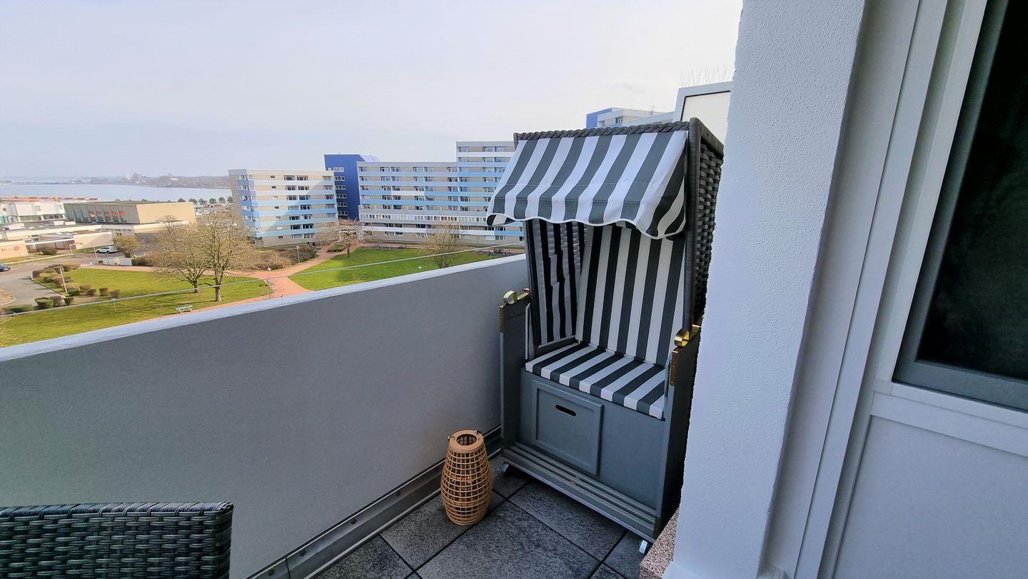Sehr schöne und mit Liebe zum Detail eingerichtete Ferienwohnung für 2 Erw. und 2 Kinder in der 6. Etage mit großem Balkon (ca. 10 qm) mit Markise und Strandkorb zum parkähnlichen Innenhof.