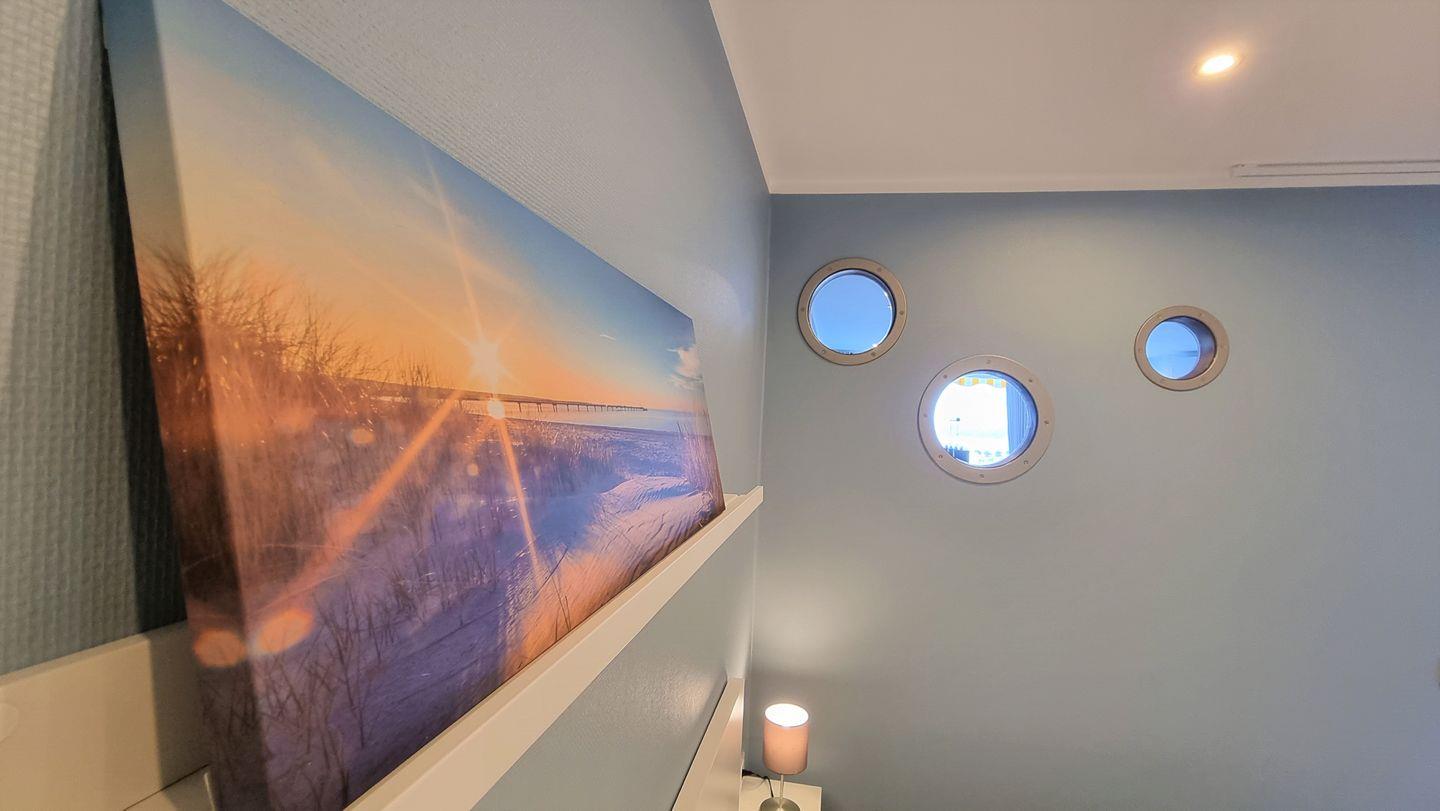 Der separate Elternschlafbereich mit Doppelbett (2x 90*200 cm) und Fernseher (80 cm Durchmesser) ist durch eine maritime Wand mit Bullaugen abgetrennt und kann durch einen Vorhang zusätzlich separiert werden.