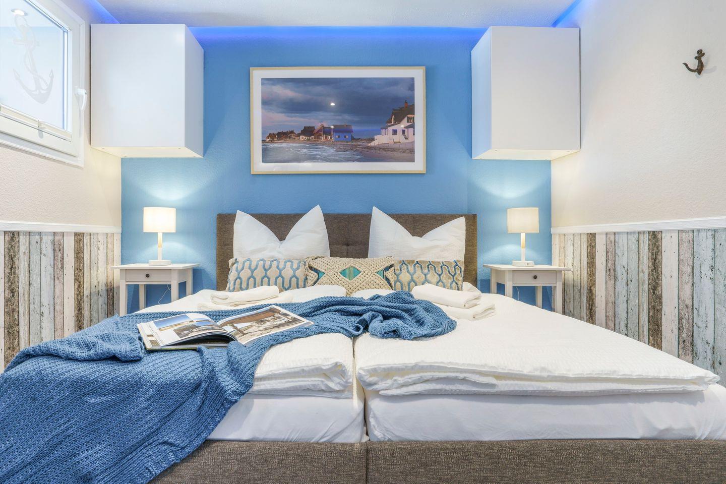 Das separate Schlafzimmer ist durch eine Tür vom Wohnbereich getrennt und bietet mit einem komfortablen Doppelbett (2 x 90 x 200 cm), Kommode und praktischen Hängeschränken viel Stauraum. Die integrierten USB-Anschlüsse in den Nachtischlampen ermöglichen bequemes Laden von Smartphone oder Tablet direkt am Bett. Öffnungsfähige Fenster sorgen für frische Ostseeluft und ein angenehmes Schlafklima.
