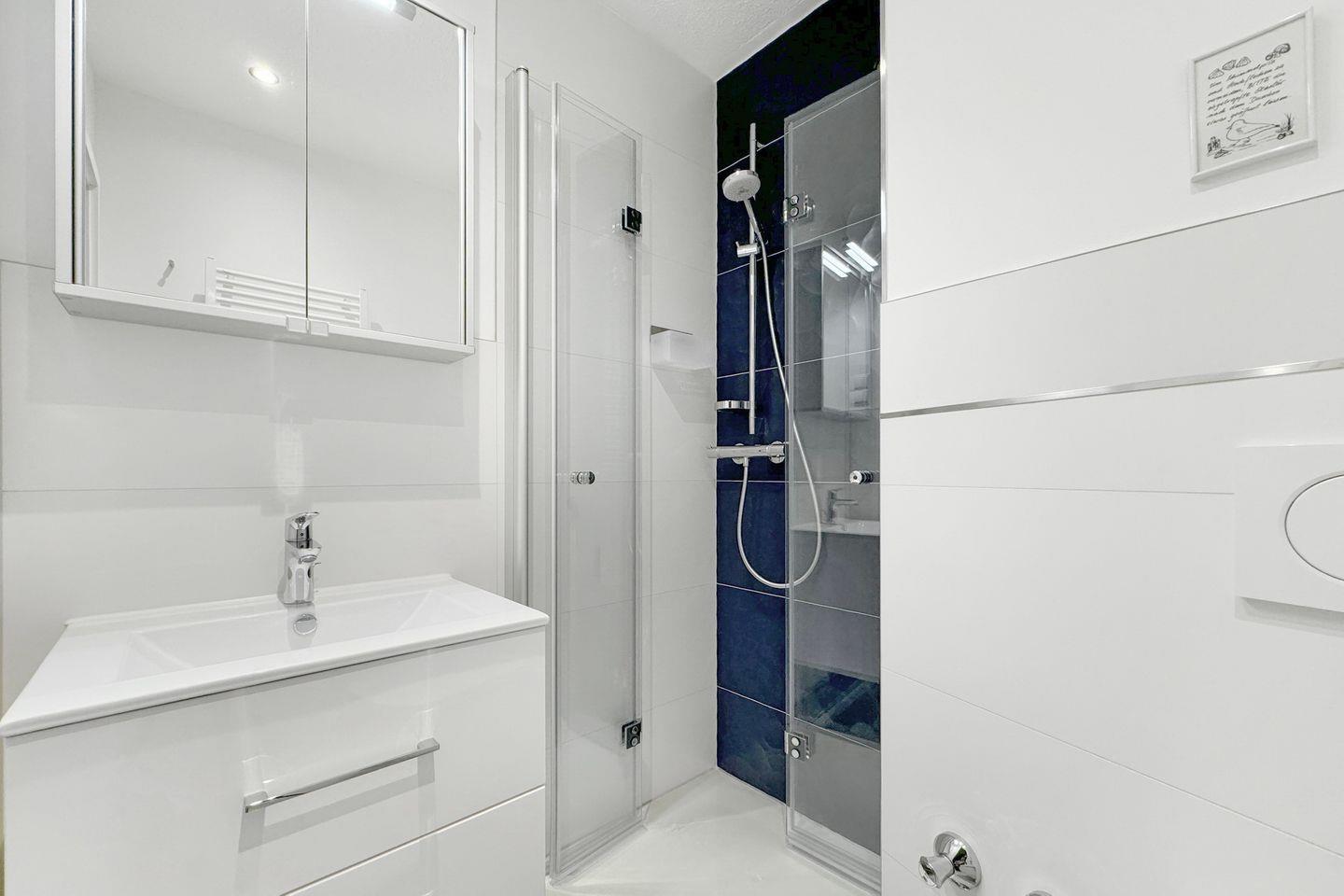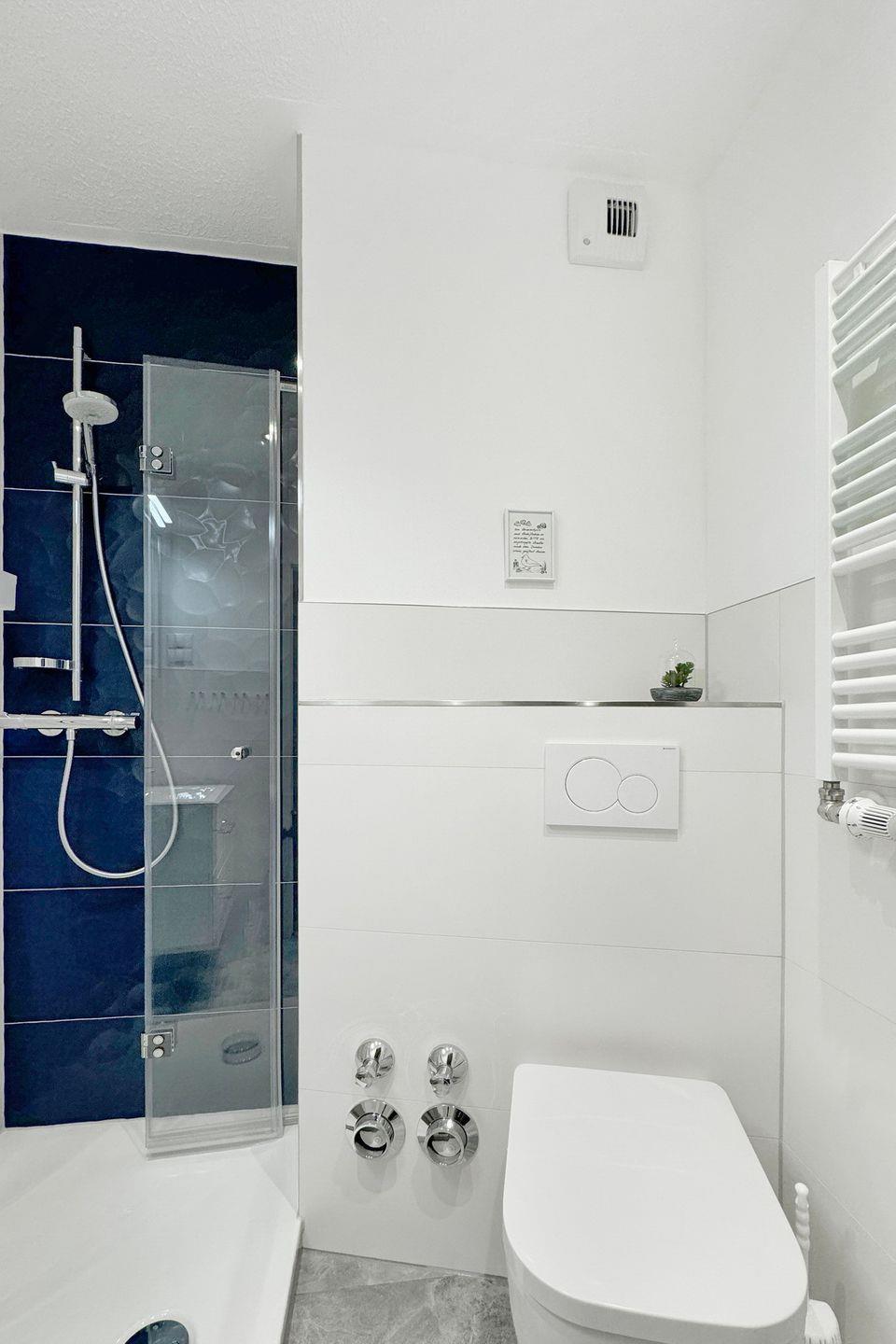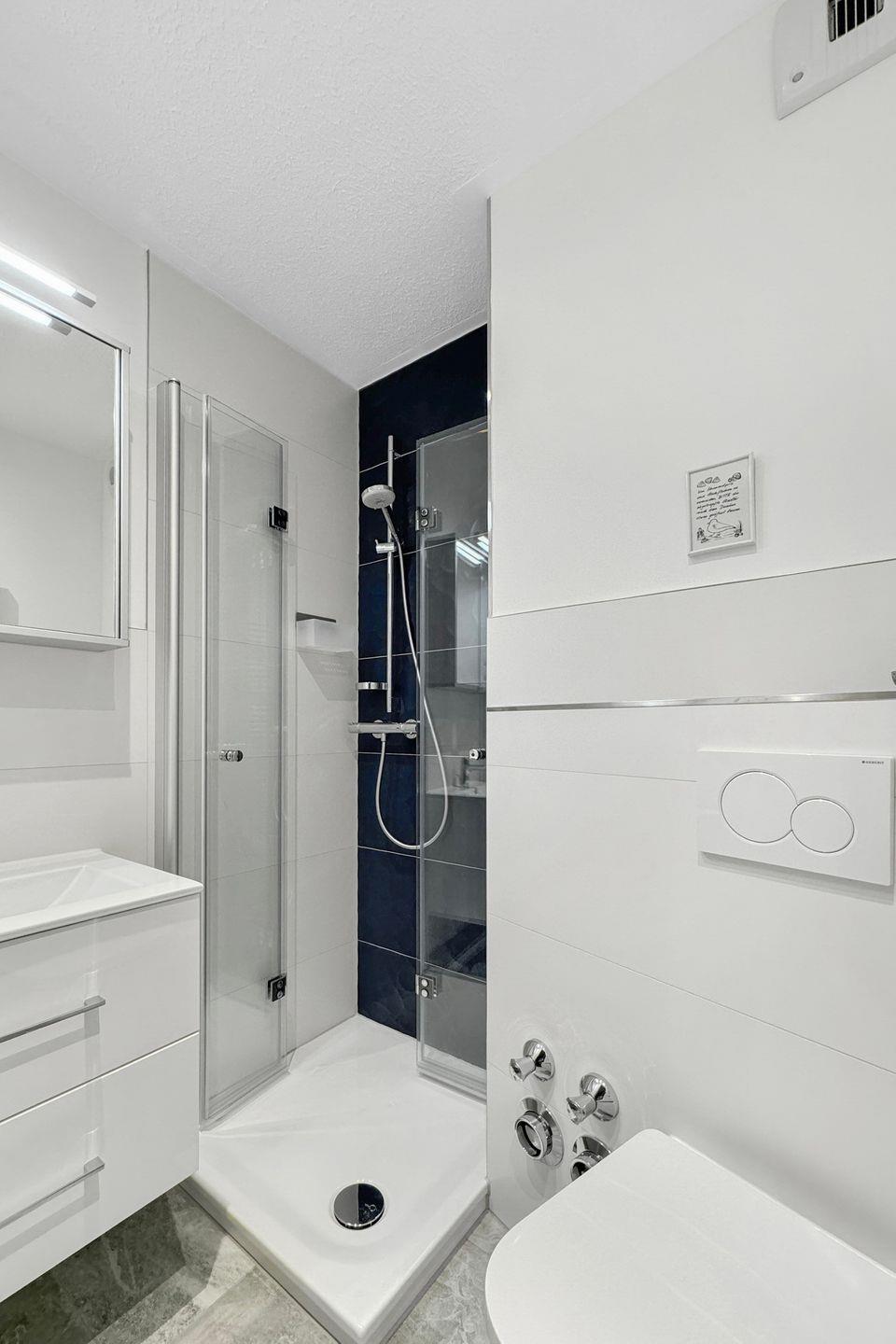 Das innenliegende Duschbad präsentiert sich modern und durchdacht mit flachem Einstieg in die Glasdusche, Handtuchheizkörper, WC sowie einem beleuchteten Spiegelschrank und praktischen Ablageflächen.