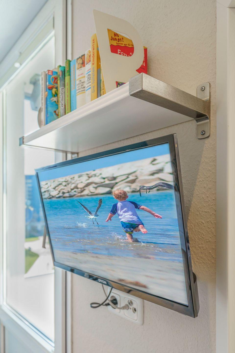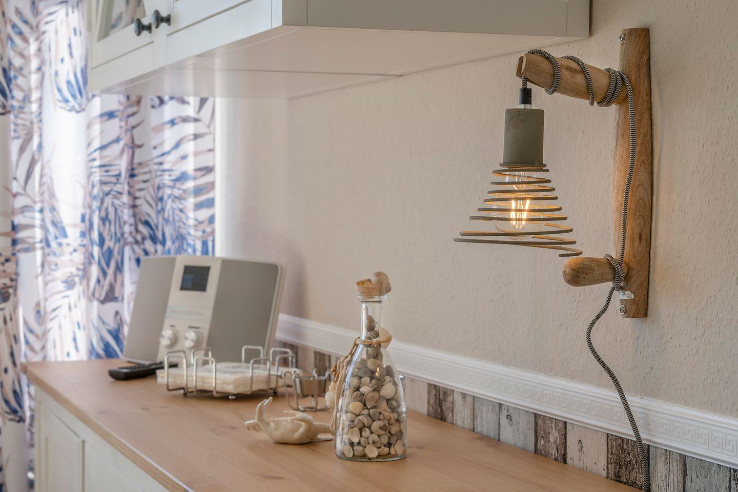 Der Wohnbereich lädt mit einer gemütlichen Sofa und einem großzügigen Essplatz für bis zu vier Personen zu entspannten Stunden ein. Technisch ist die Wohnung bestens ausgestattet: Ein Flatscreen-TV, DVD-Player, WLAN mit 50 Mbit sowie ein zusätzliches Internetradio sorgen für Unterhaltung nach Wunsch. Ein besonderes Highlight ist die abgehängte Decke mit integriertem, farblich einstellbarem Lichtband. In Kombination mit dimmbaren Spots entsteht am Abend eine besonders stimmungsvolle und behagliche Atmosphäre – perfekt für entspannte Urlaubstage.