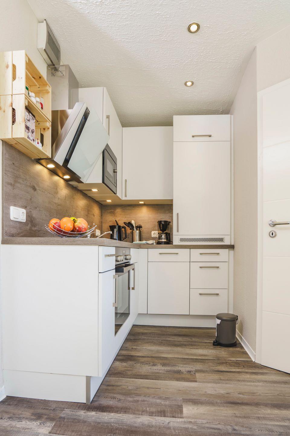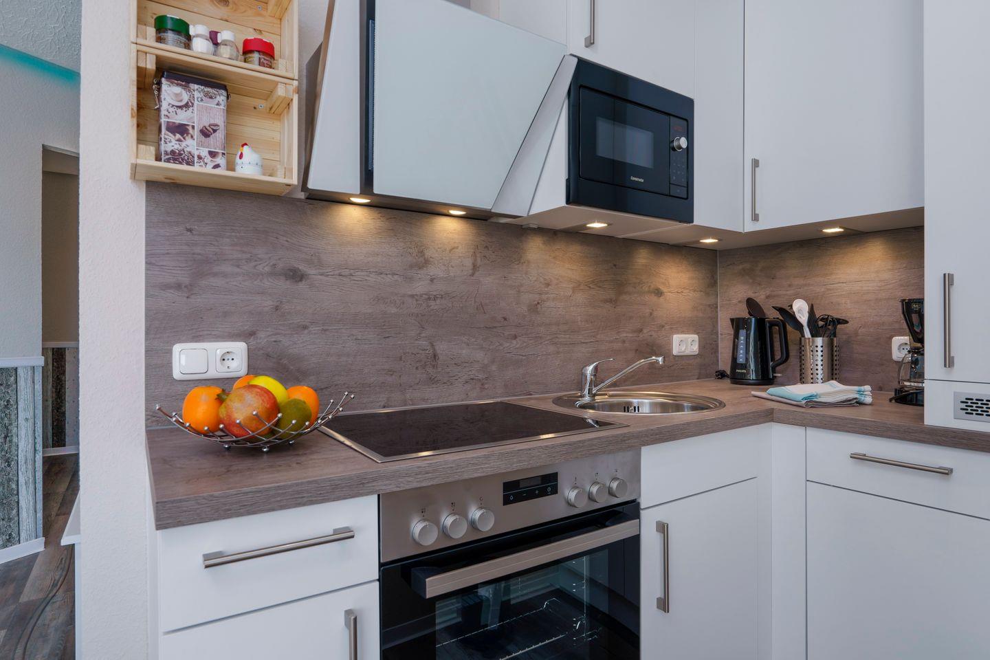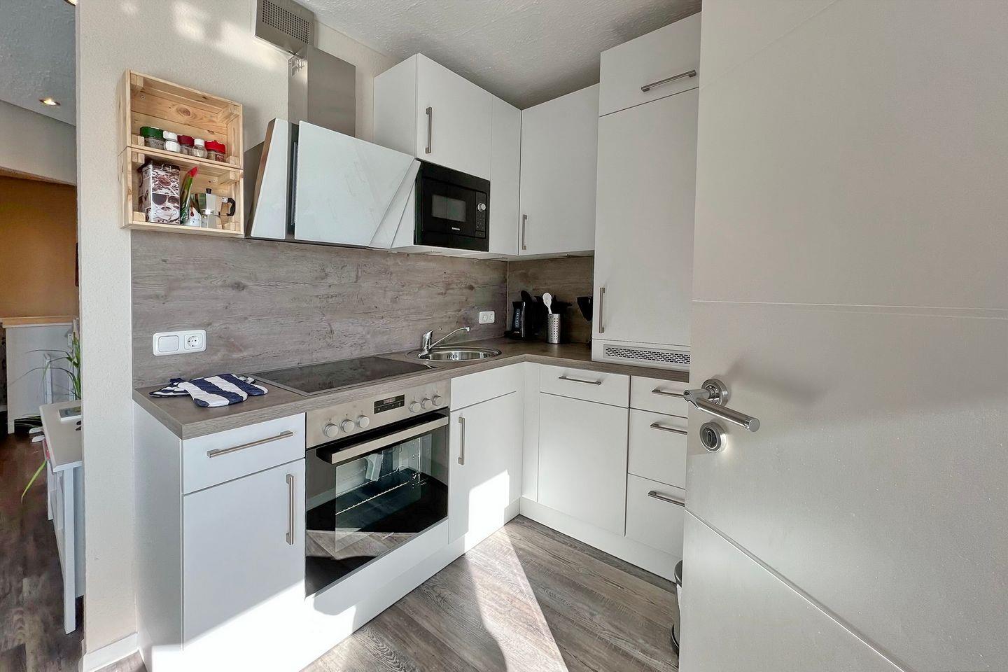 Die offene Einbauküche ist funktional und hochwertig ausgestattet. Ein großer Kühlschrank, Cerankochfeld, Backofen, Geschirrspüler und Mikrowelle stehen ebenso zur Verfügung wie sämtliche Küchenutensilien, Geschirr und Kochgeschirr – ideal für gemeinsame Kochabende.