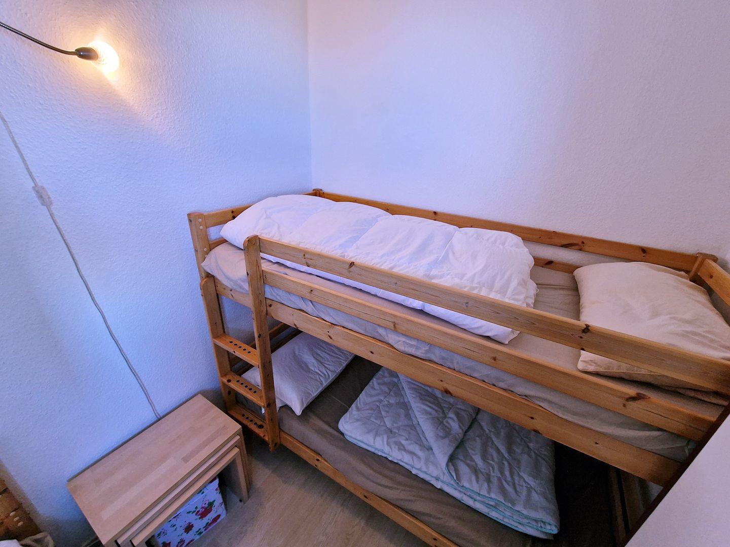 Der Schlafbereich ist praktisch durch einen Vorhang abtrennbar und sorgt für erholsame Nächte. Zusätzlich gibt es ein separates Kinderzimmer mit einem Etagenbett (1,80 m lang) und einem Einzelbett (1,60 m lang) – ideal für Familien mit Kindern.