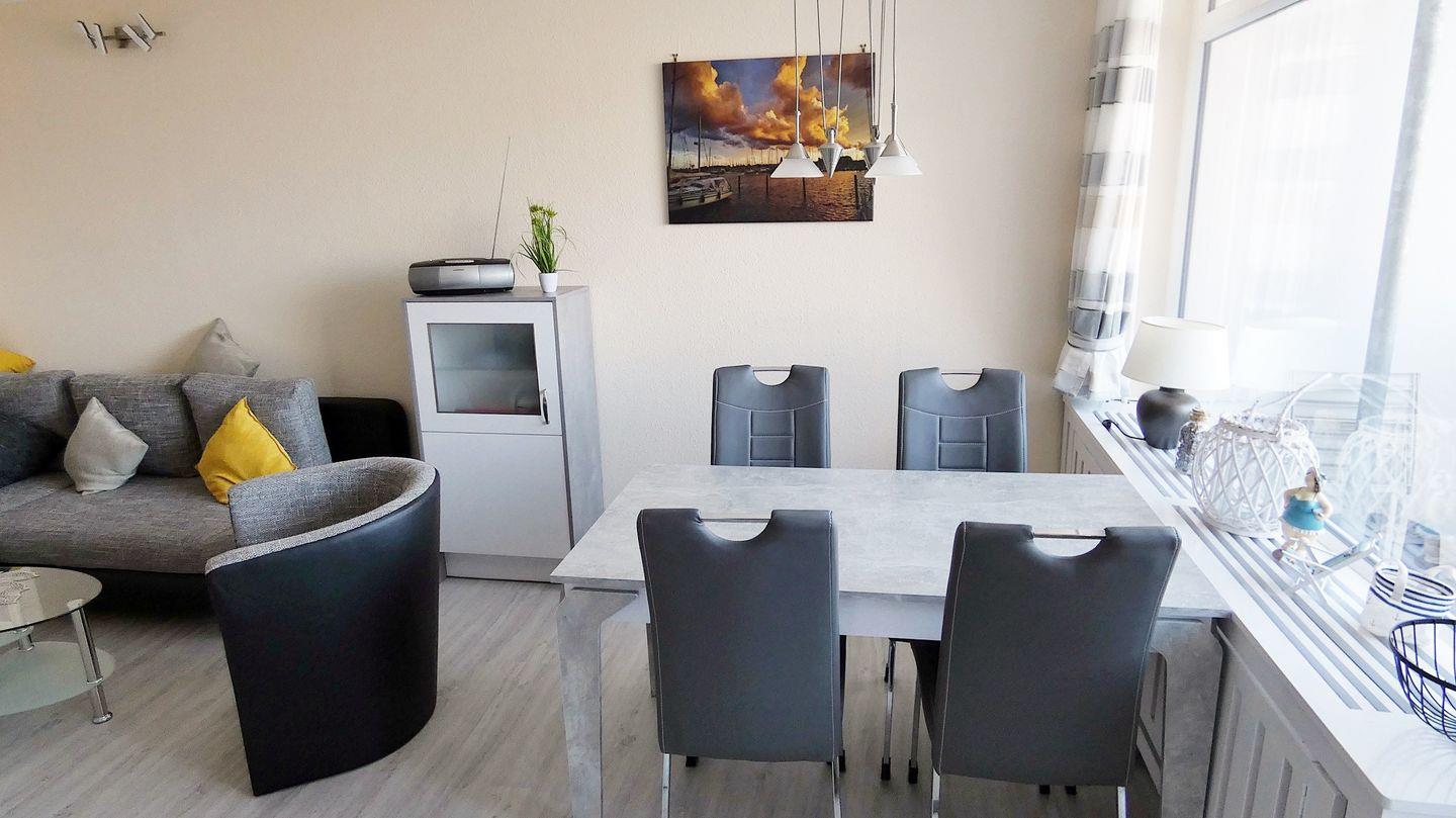 Direkt am Fenster gelegen befindet sich der Essbereich mit herrlichem Blick auf die Salzwiesen sowie zur Ostsee.