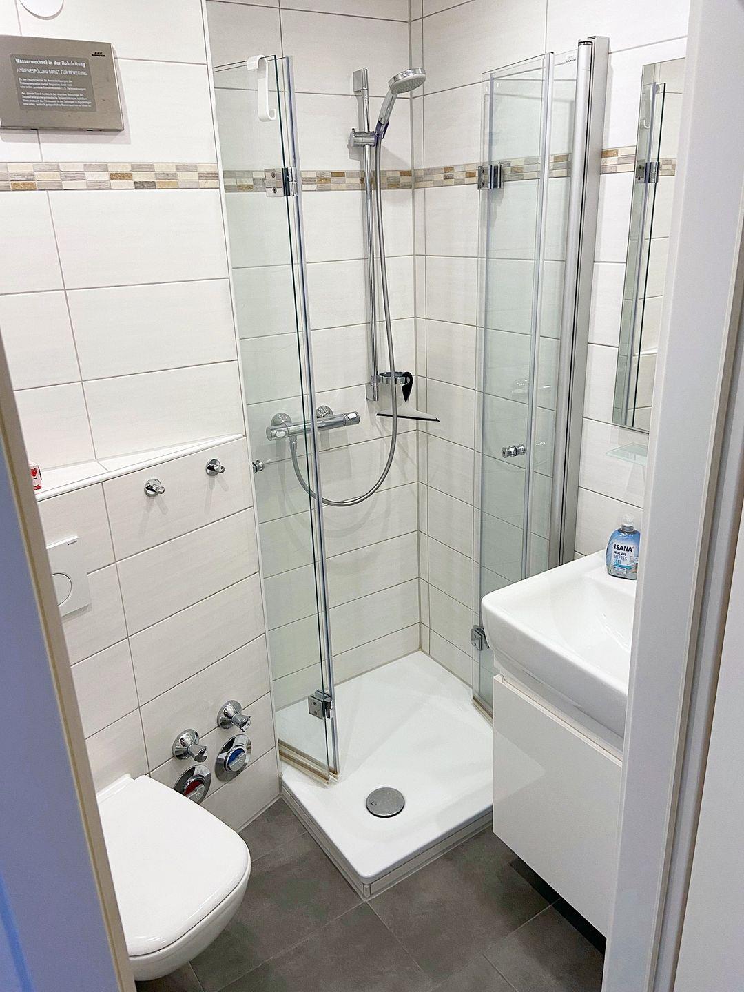 Das sanierte Bad verfügt über eine moderne und hochwertige Duschkabine, Hänge-WC sowie einen Handtuchheizkörper.