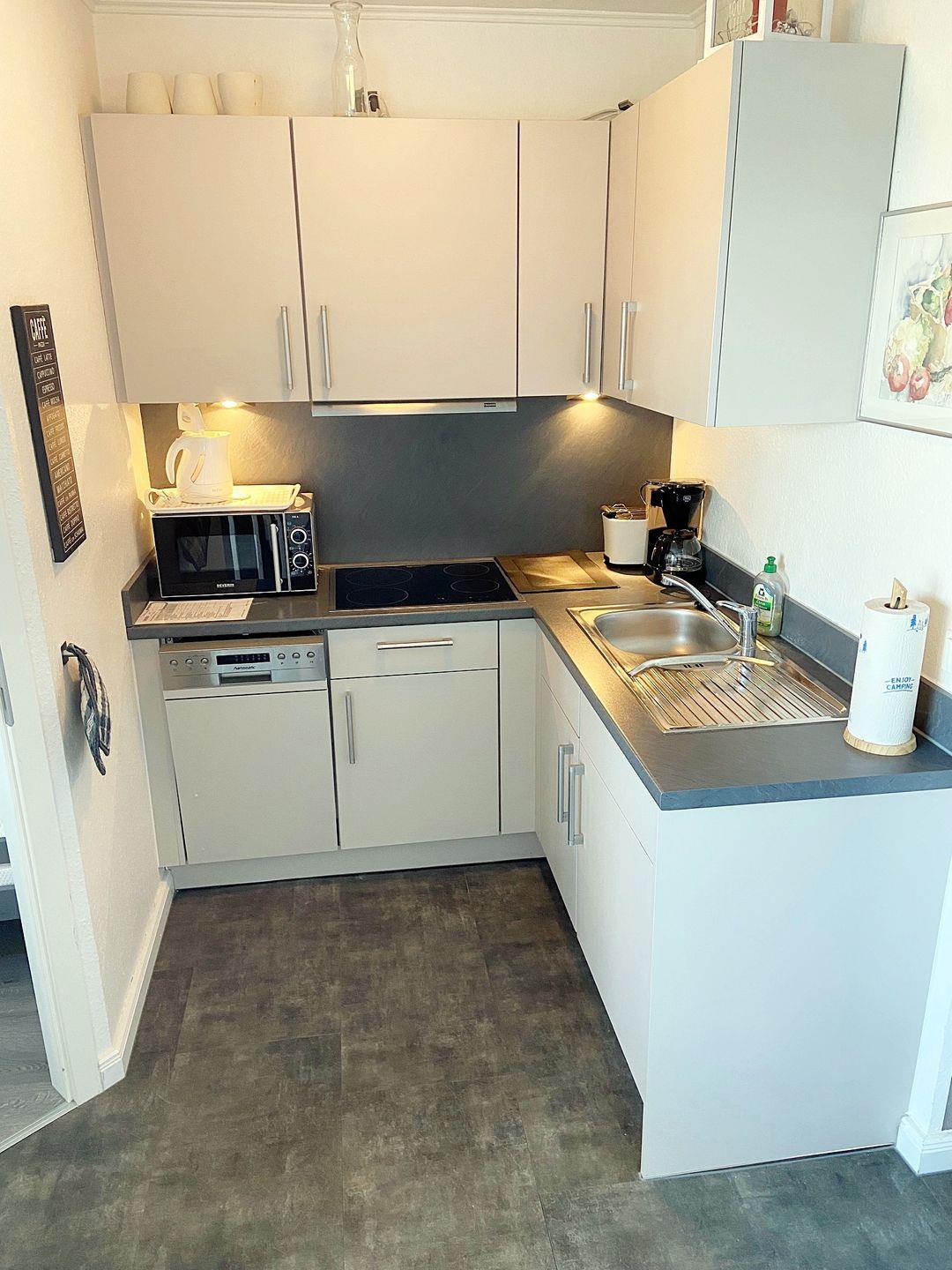 Moderner Küchenbereich ausgestattet mit Kühlschrank inkl. Gefrierfach, Ceranfeld, Mikrowelle und Geschirrspülmaschine.