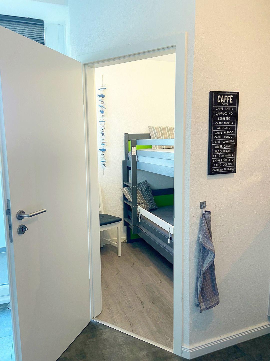Schlafbereich mit neuem Doppelbett. Sep. Kinderzimmer mit Etagenbett.