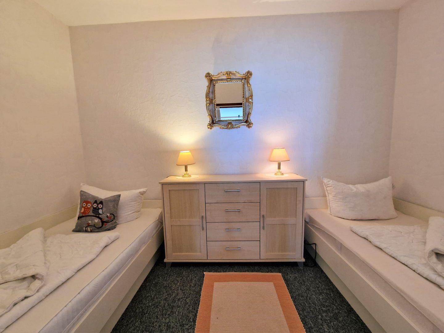 Der Schlafbereich ist mit 2 Einzelbetten sowie einer Kommode ausgestattet und durch einen Vorhang zum Wohnbereich getrennt.