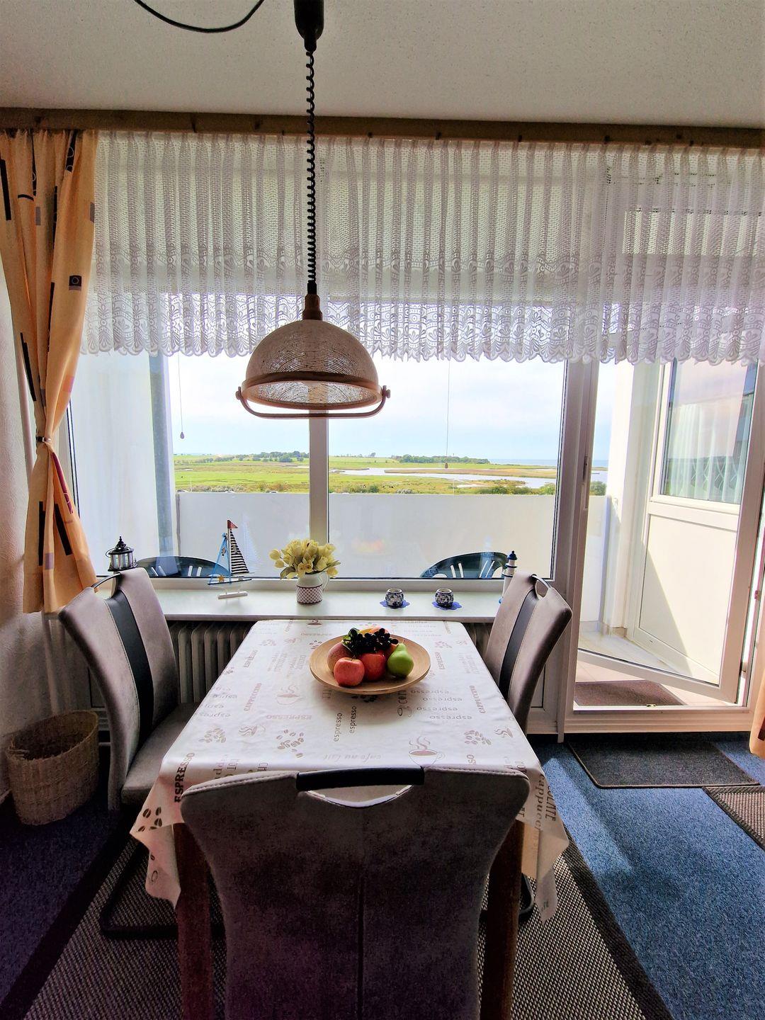 Herrlicher Blick über das Naturschutzgebiet in Richtung Ostsee. Wohnraum mit einer 3er Couch u. 2 Sesseln, Essecke am Fenster, TV, Radio.