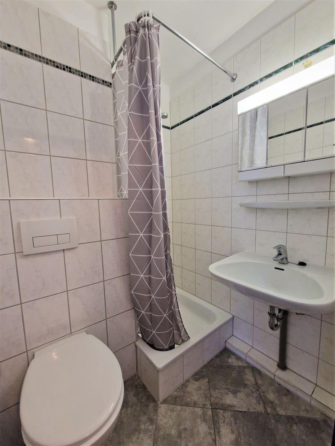 Das Badezimmer ist mit Dusche und WC ausgestattet.