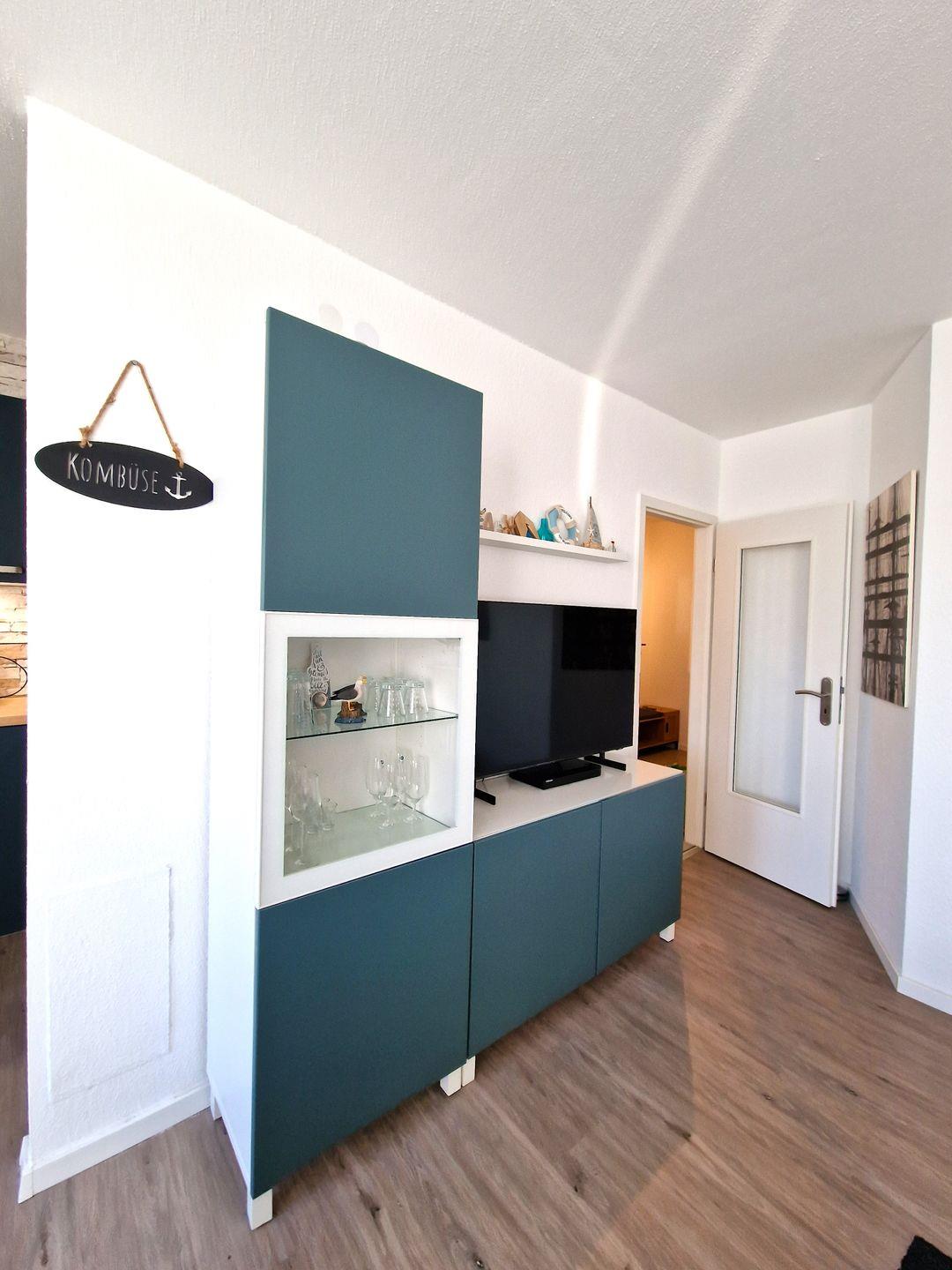 Im Wohnbereich befindet sich eine gemütliche Couchgarnitur samt 50"-LED-TV, ein Internetradio und Blue-Ray-Player.