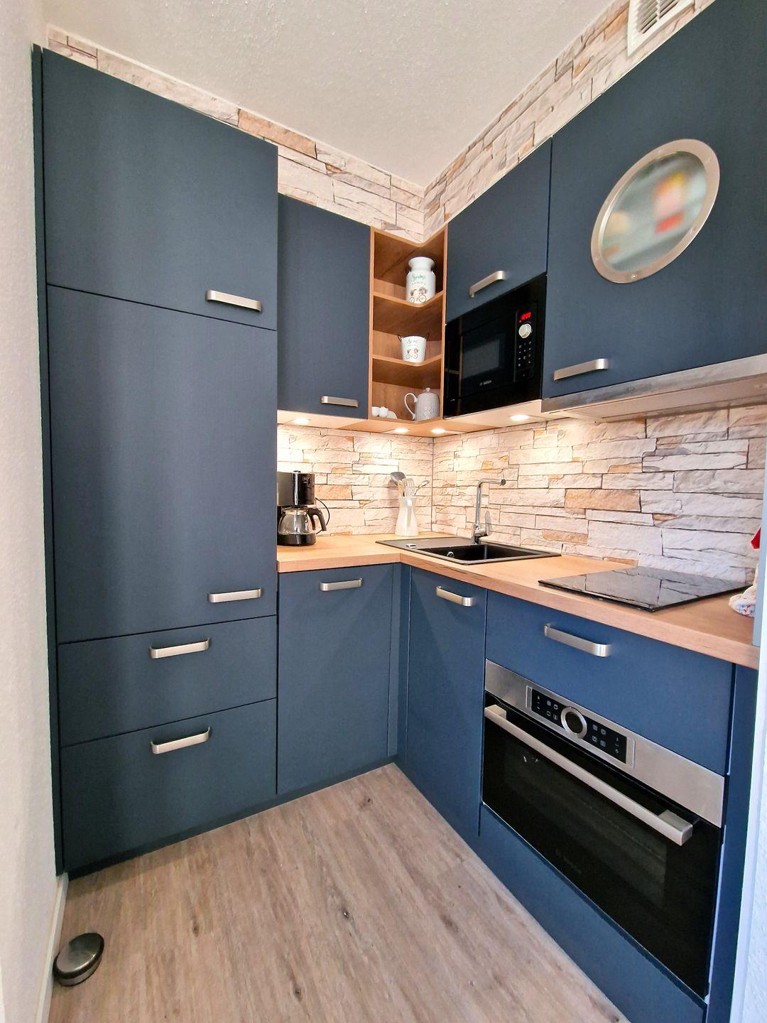 In der Küchenzeile stehen ein 2-Plattenherd, eine Mikrowelle, ein Backofen, ein Kühlschrank mit Tiefkühler, sowie ein Geschirrspüler und eine Kaffeemaschine zur Verfügung.