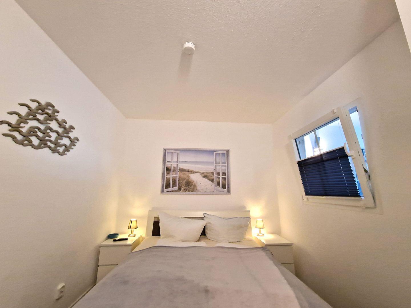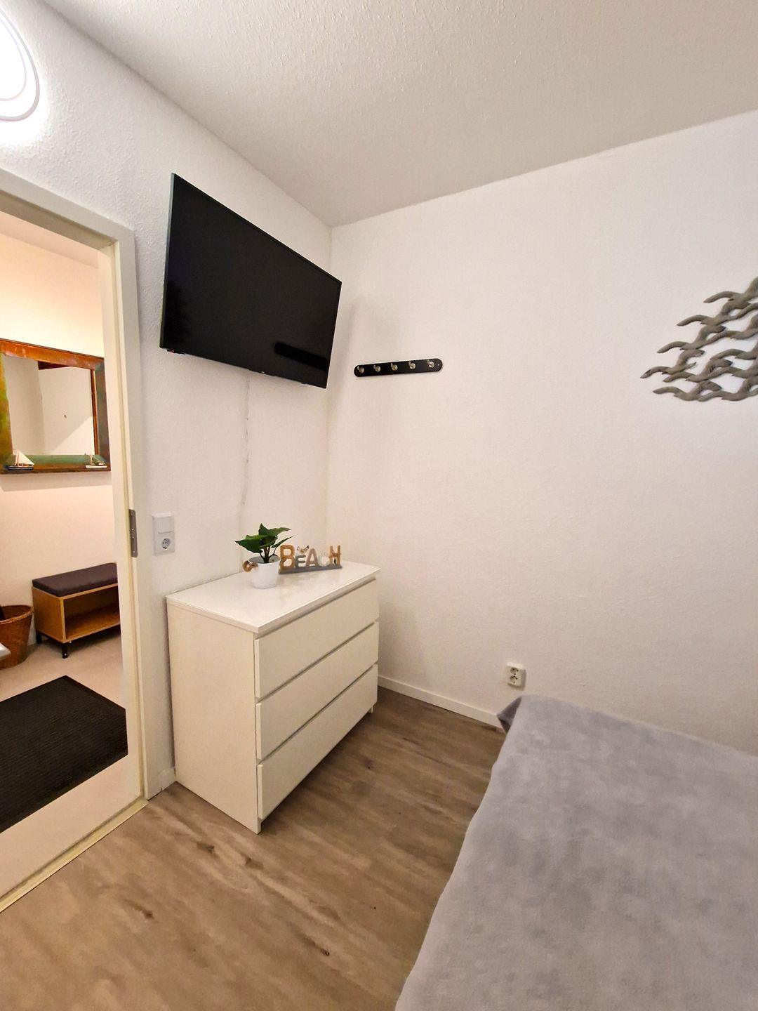 Der separate Schlafbereich mit Zugang vom Flur verfügt über ein Doppelbett (2 Matratzen von jeweils 80 x 200 cm) und ebenfalls ein TV-Gerät (mit 32 Zoll).