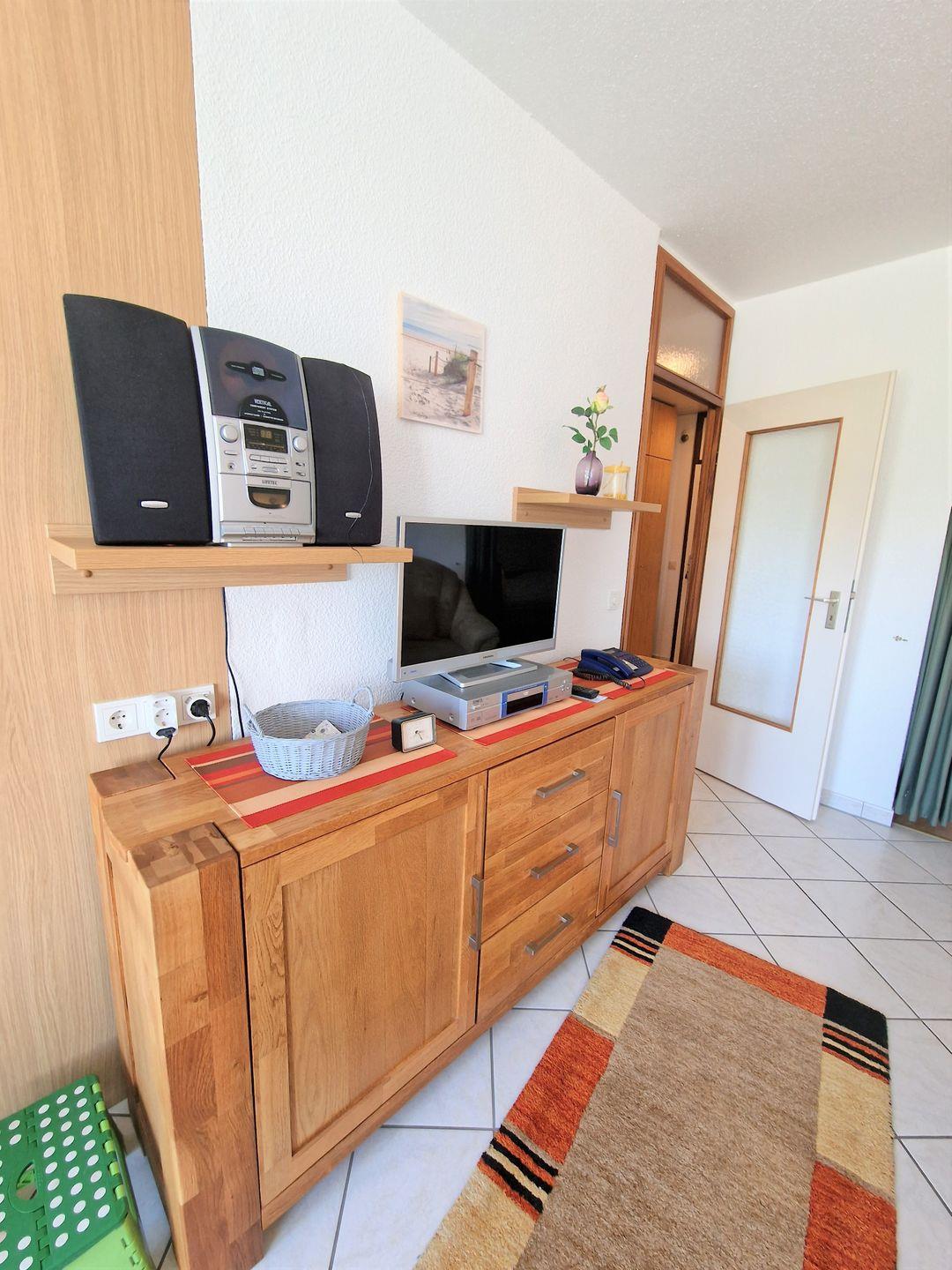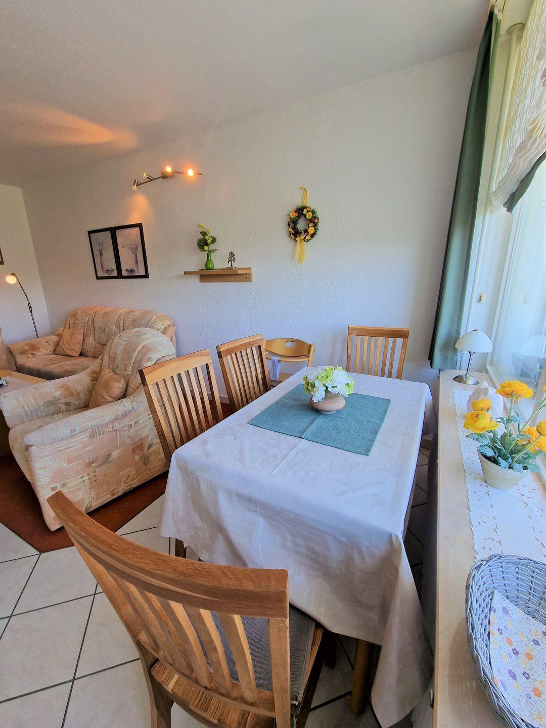 Wohnbereich mit einer neuen bequemen 3er Couch und 2 Sesseln, Essecke am Fenster, LCD-TV , DVD und CD/Musikanlage.
