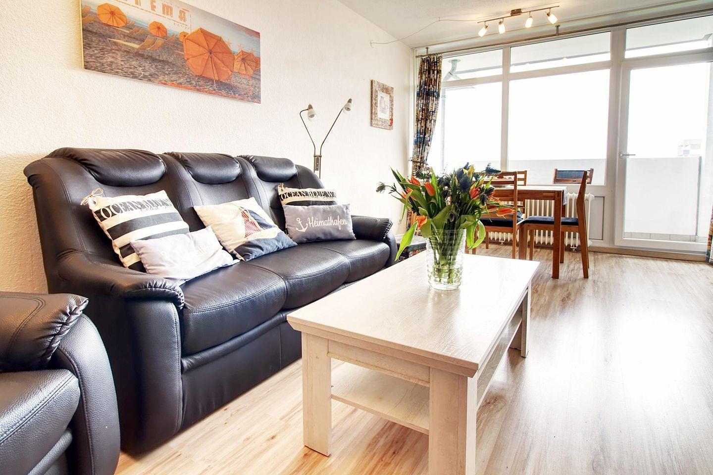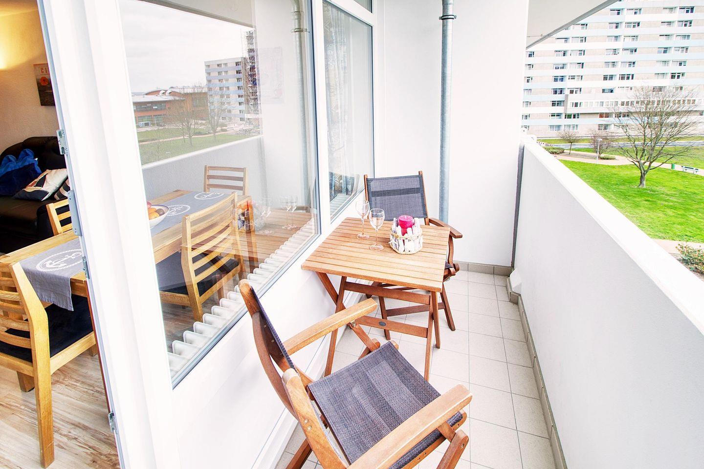 Liebevoll und modern hell eingerichtete Wohnung in der 4. Etage mit Balkon zur Innenhof/Ostseite und Blick auf den Binnensee.
