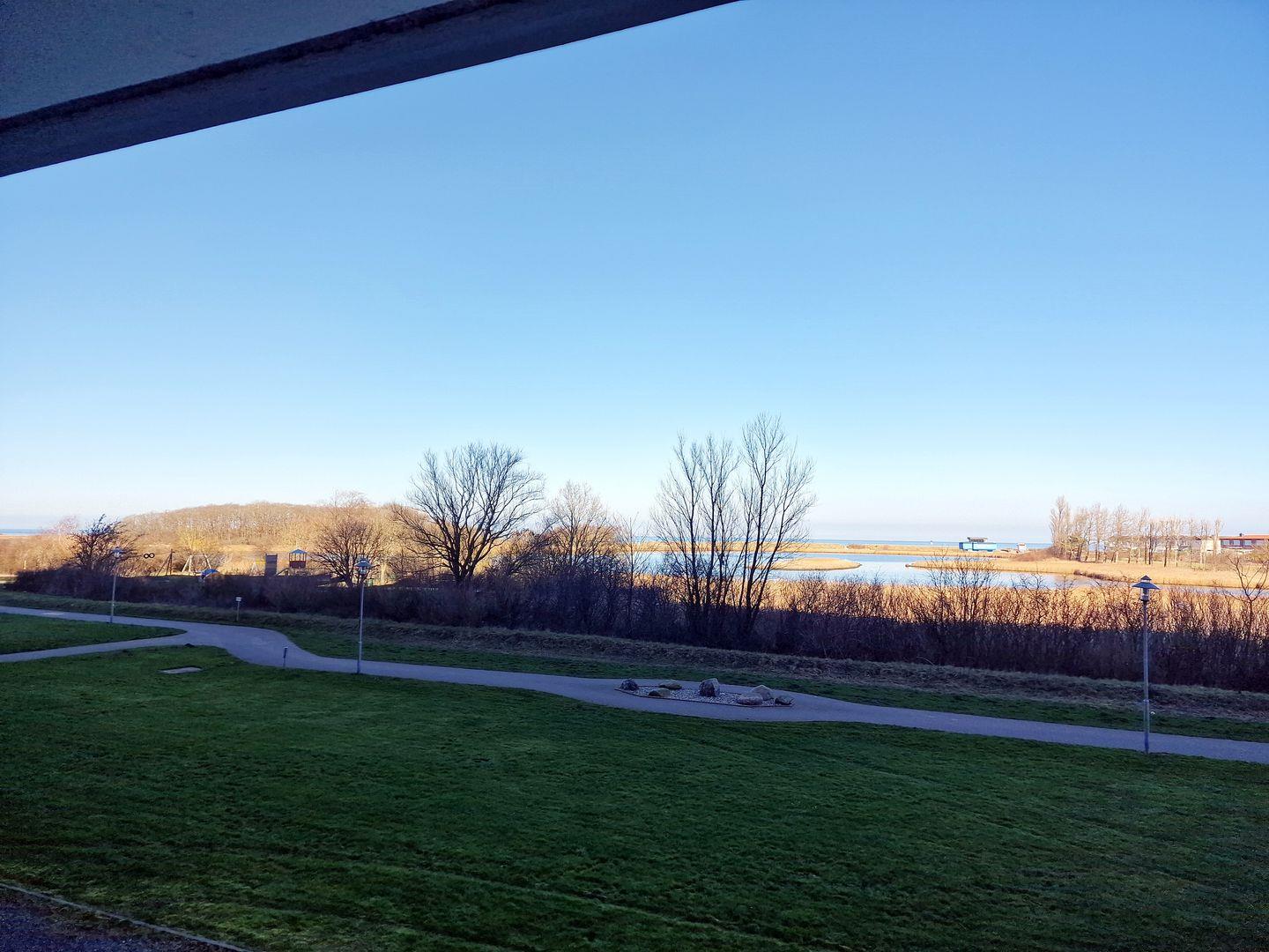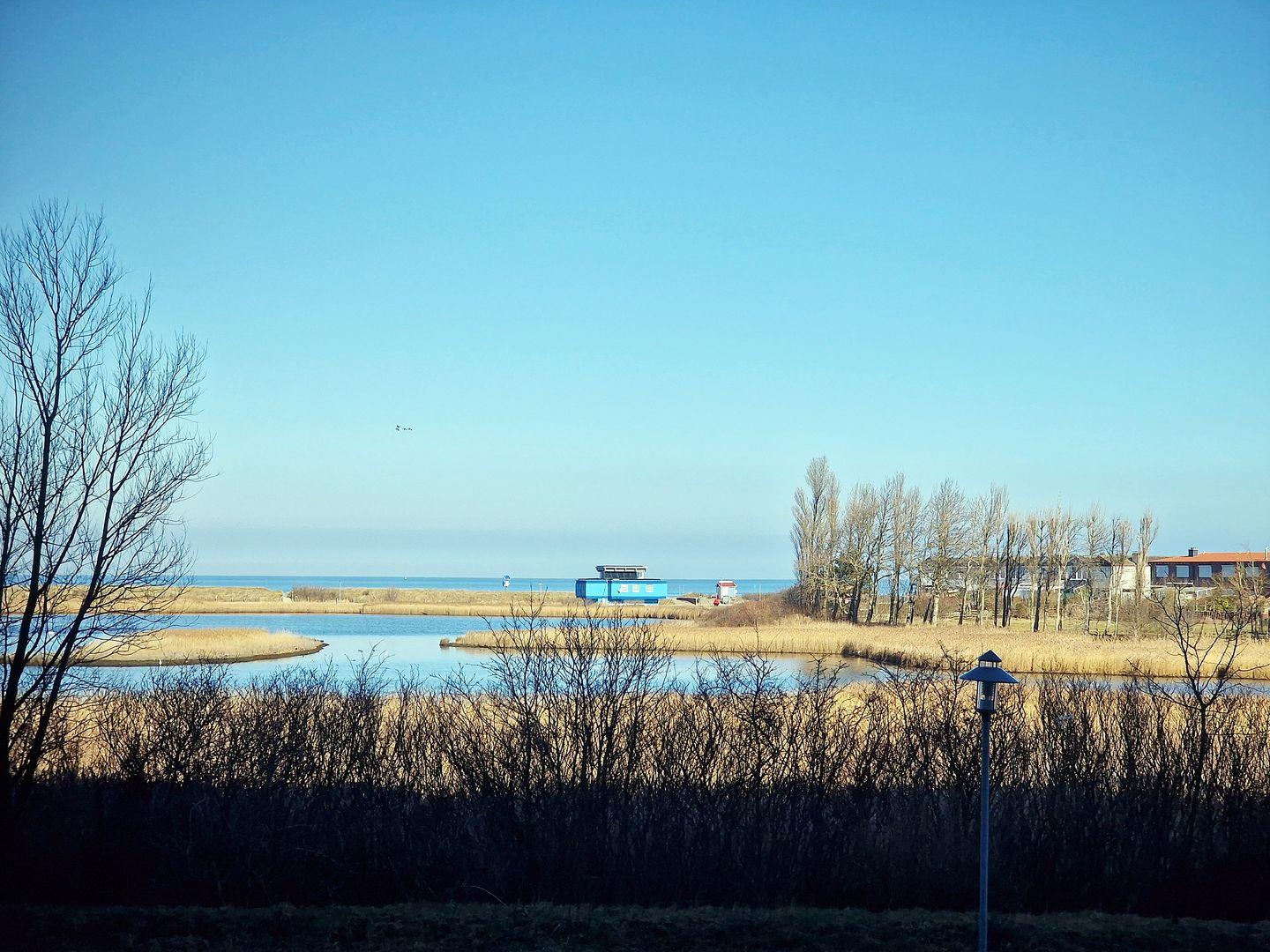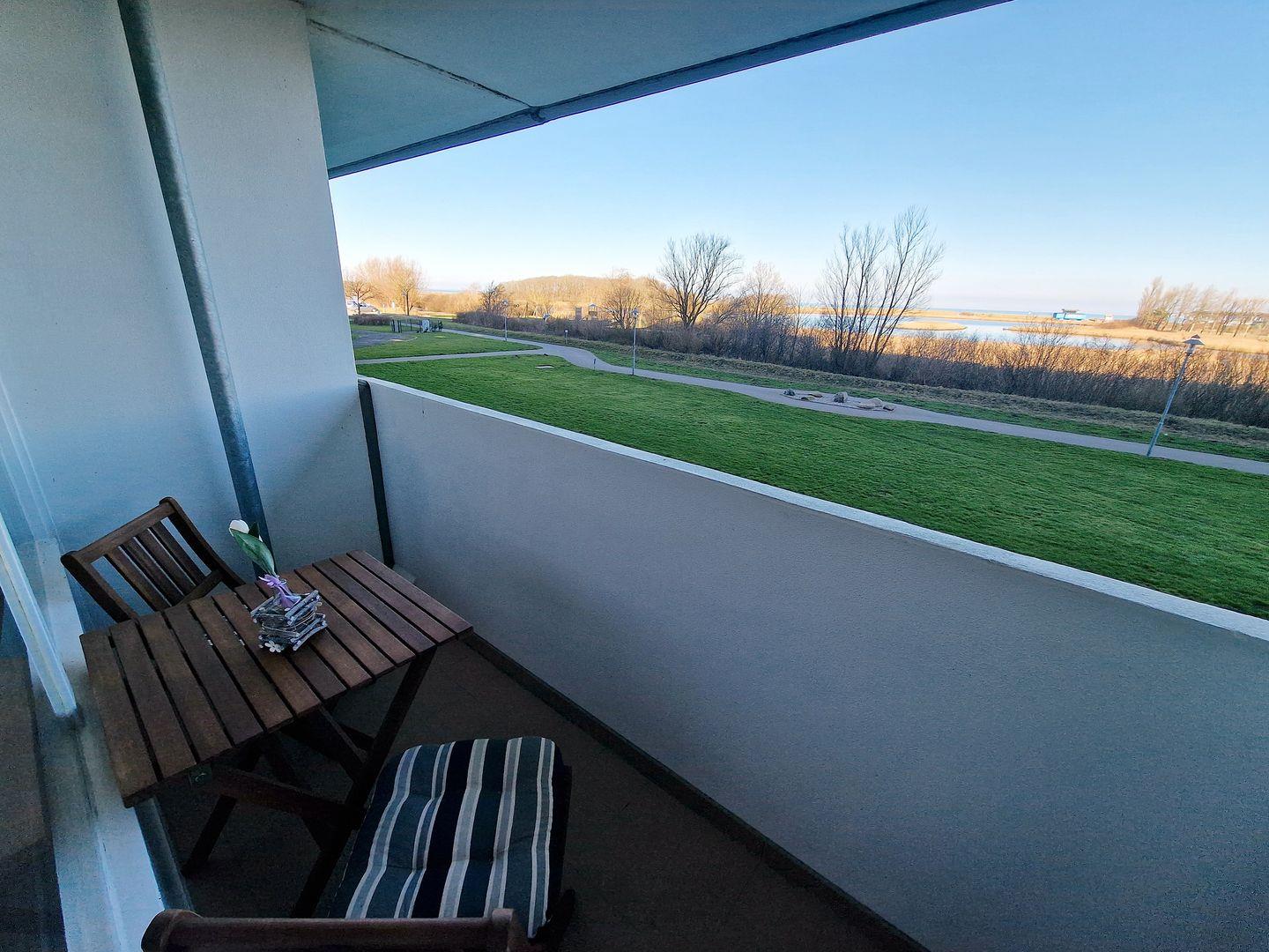 Der Wohnbereich lädt mit einem großen Sofa und zwei bequemen Relax-Sesseln zum Entspannen ein. Für Unterhaltung sorgen Flachbildfernseher, WLAN, Musikanlage mit CD und ein DVD-Player. Vom Wohnbereich aus gelangen Sie auf den möblierten Nord-Balkon mit Blick auf Salzwiesen und die Ostsee – perfekt für ruhige Momente im Freien.