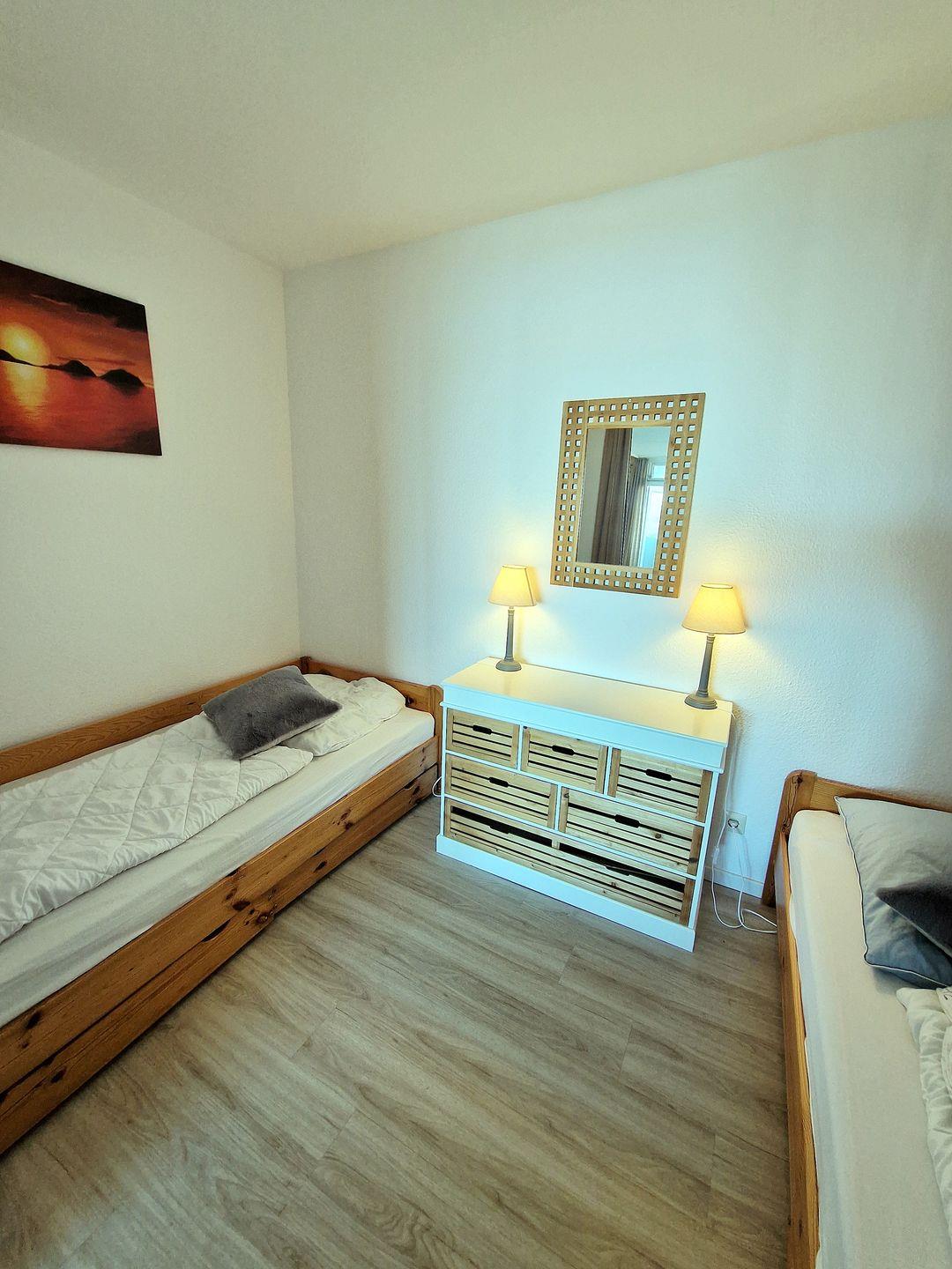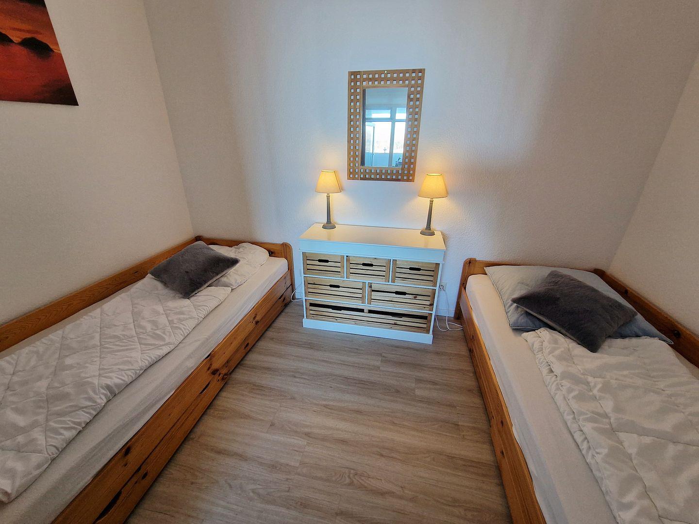 Im Schlafzimmer, das durch einen Verdunklungsvorhang vom Wohnbereich abgetrennt ist, stehen zwei Einzelbetten sowie eine Kommode mit Nachttischlampen für erholsame Nächte bereit.