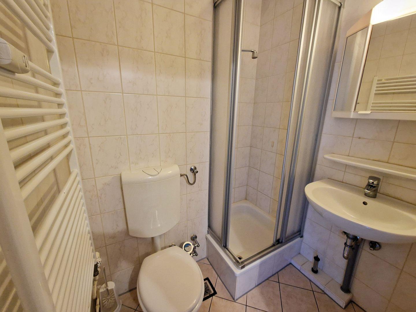 Das innenliegende Duschbad verfügt über WC, Duschkabine, Waschbecken, Spiegelschrank und eine Heizung mit Handtuchhaltefunktion.