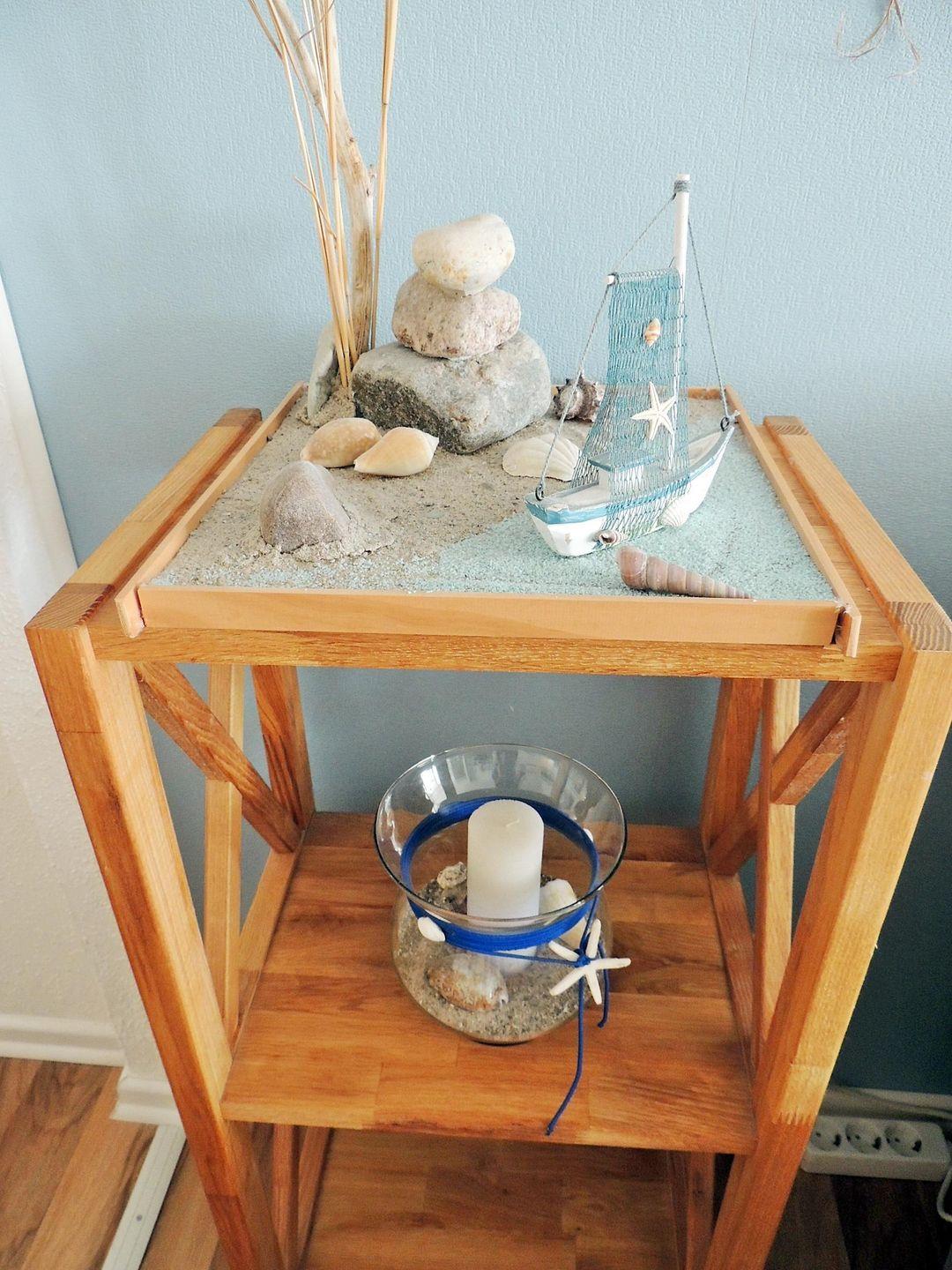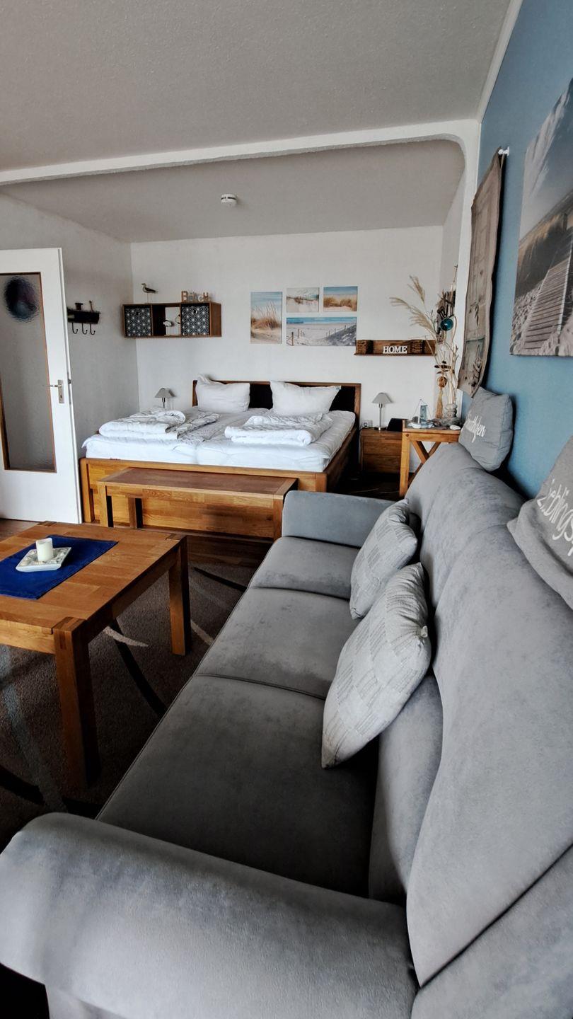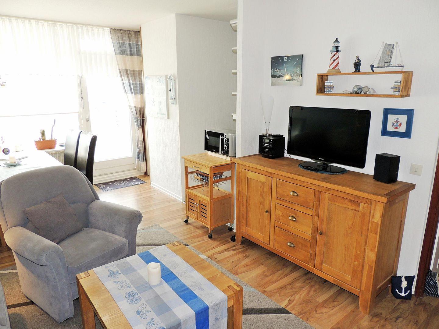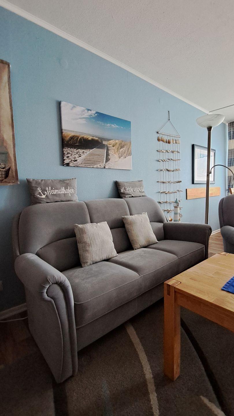 Die Wohnung verfügt über einen modernen Laminat- Bodenbelag und hat ein frisches maritimes Flair. Wohnraum mit einer neuen, grauen Couchgarnitur und 1 Sessel,81er LCD-TV und Musikanlage.