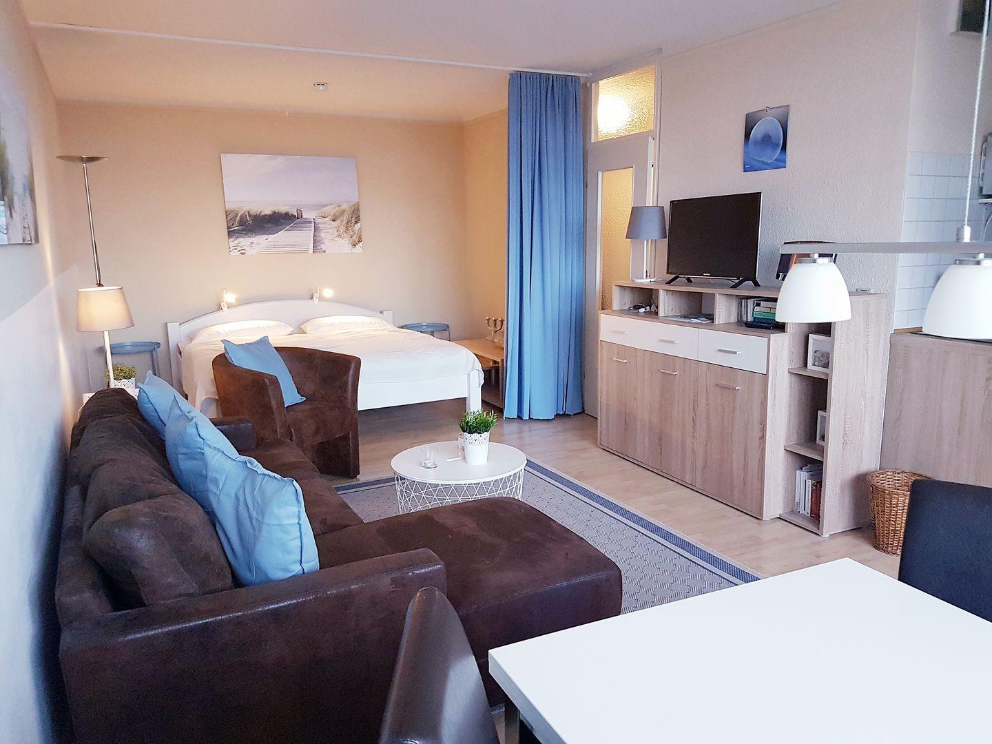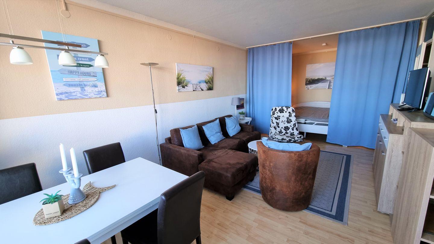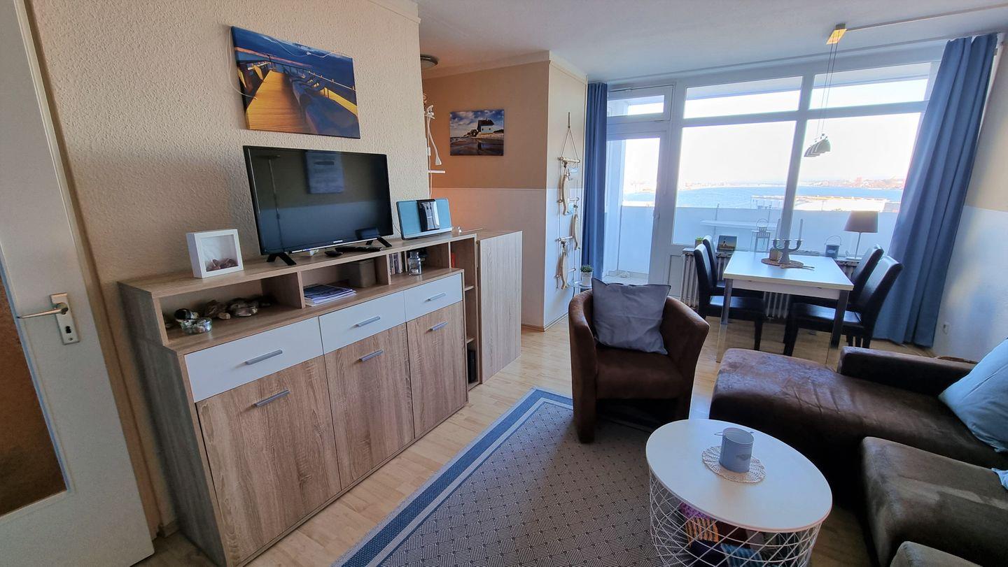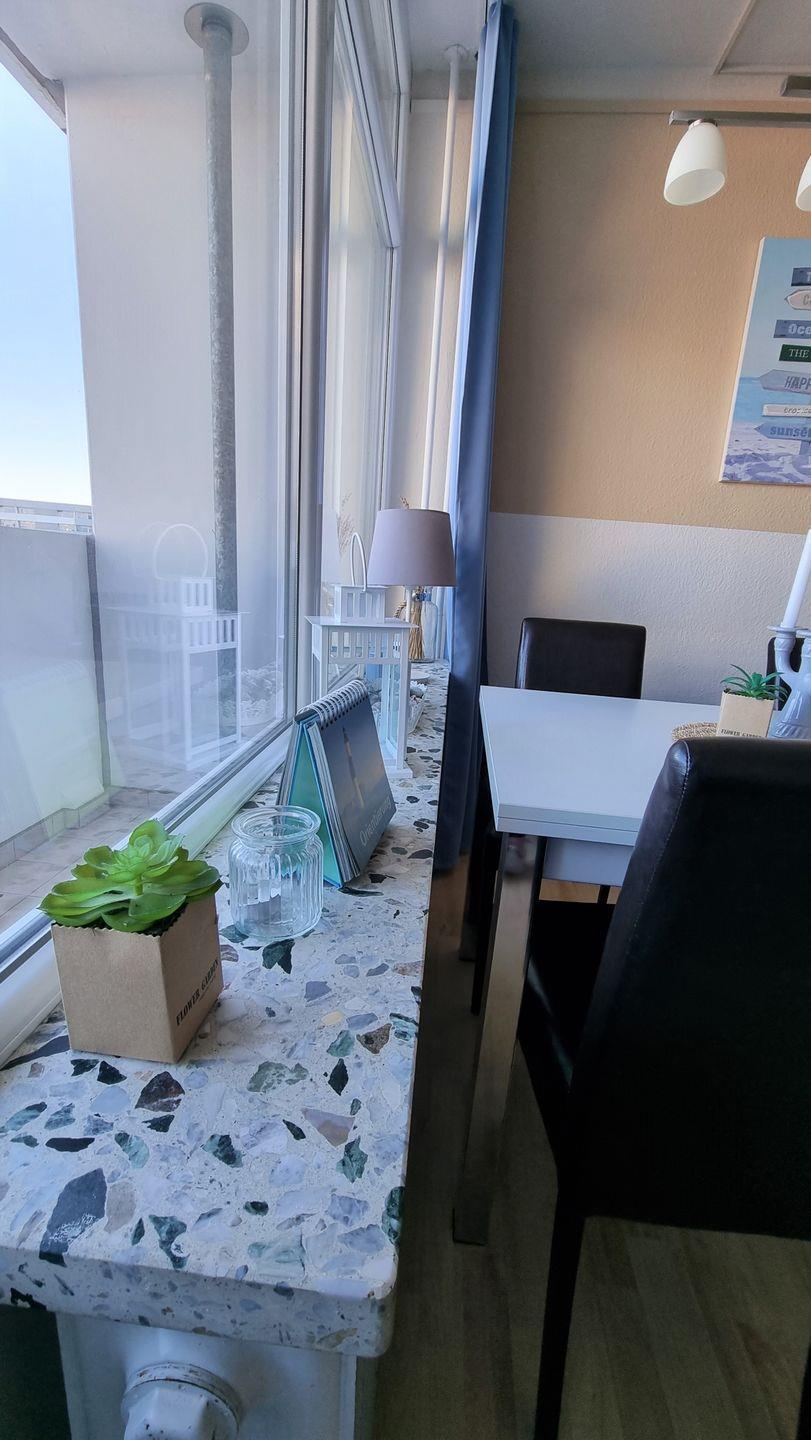 Freundliche Ferienwohnung in der 6. Etage mit Balkon zur Ostseite und herrlichem Blick auf Ostsee und Binnensee.