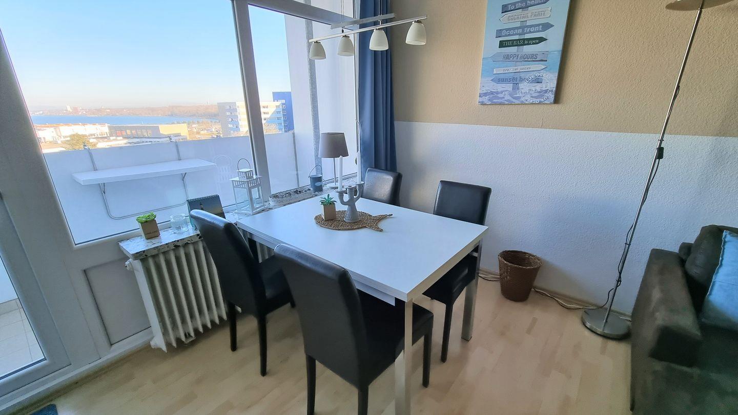 Helle Ferienwohnung in der 6. Etage mit Balkon zur Ostseite und herrlichem Blick auf Ostsee und Binnensee.