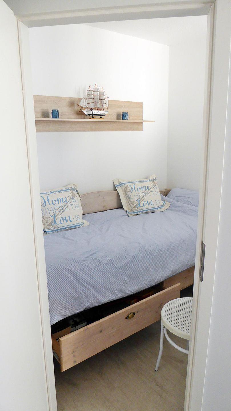 Der Schlafbereich mit Doppelbett ist durch eine Wand mit Durchgang vom Wohnzimmer getrennt.