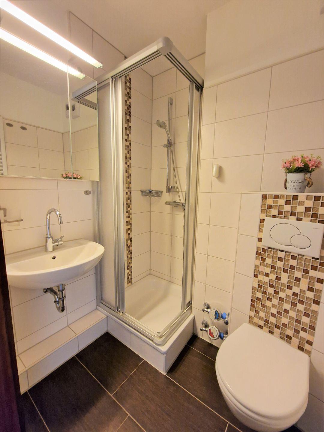 Das schicke, moderne Bad verfügt über eine Duschkabine mit flachem Einstieg sowie einem Hänge-WC.