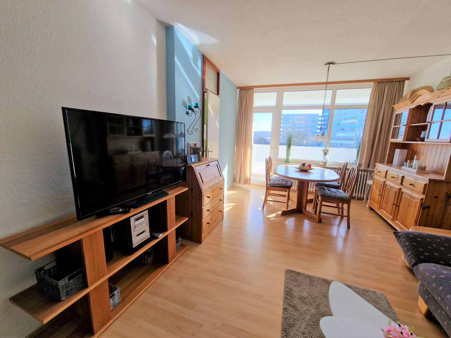 Der Wohnbereich ist ausgestattet mit einer gemütlichen Couchgarnitur sowie einem 102cm Flachbild-TV.