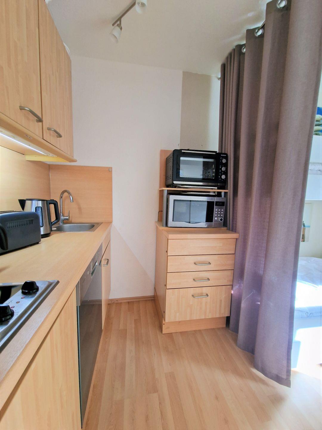 Die Küchenzeile ist mit einem 2er Ceranfeld sowie einer Mikrowelle, einem Kühlschrank mit Gefrierfach sowie einer Kaffeemaschine ausgestattet- für die gesunde Erfischung steht sogar einen Smoothie-Maker zur Verfügung.