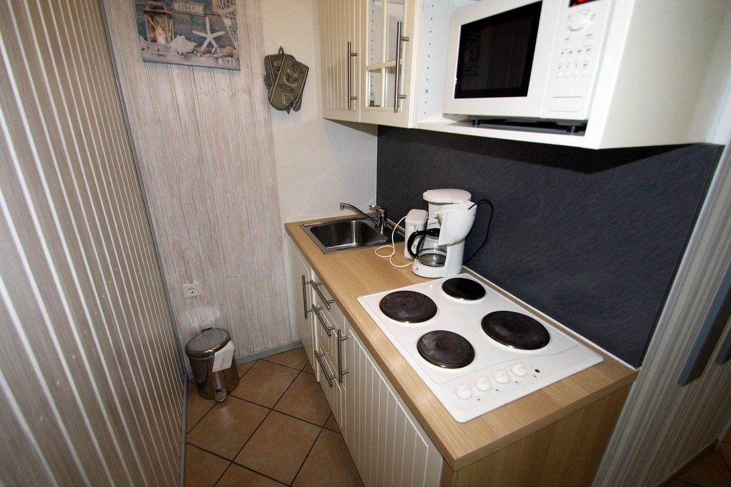 Neuer Küchenbereich mit 4-Plattenherd,Mikrowelle, Kaffeemaschine, Kühlschrank.