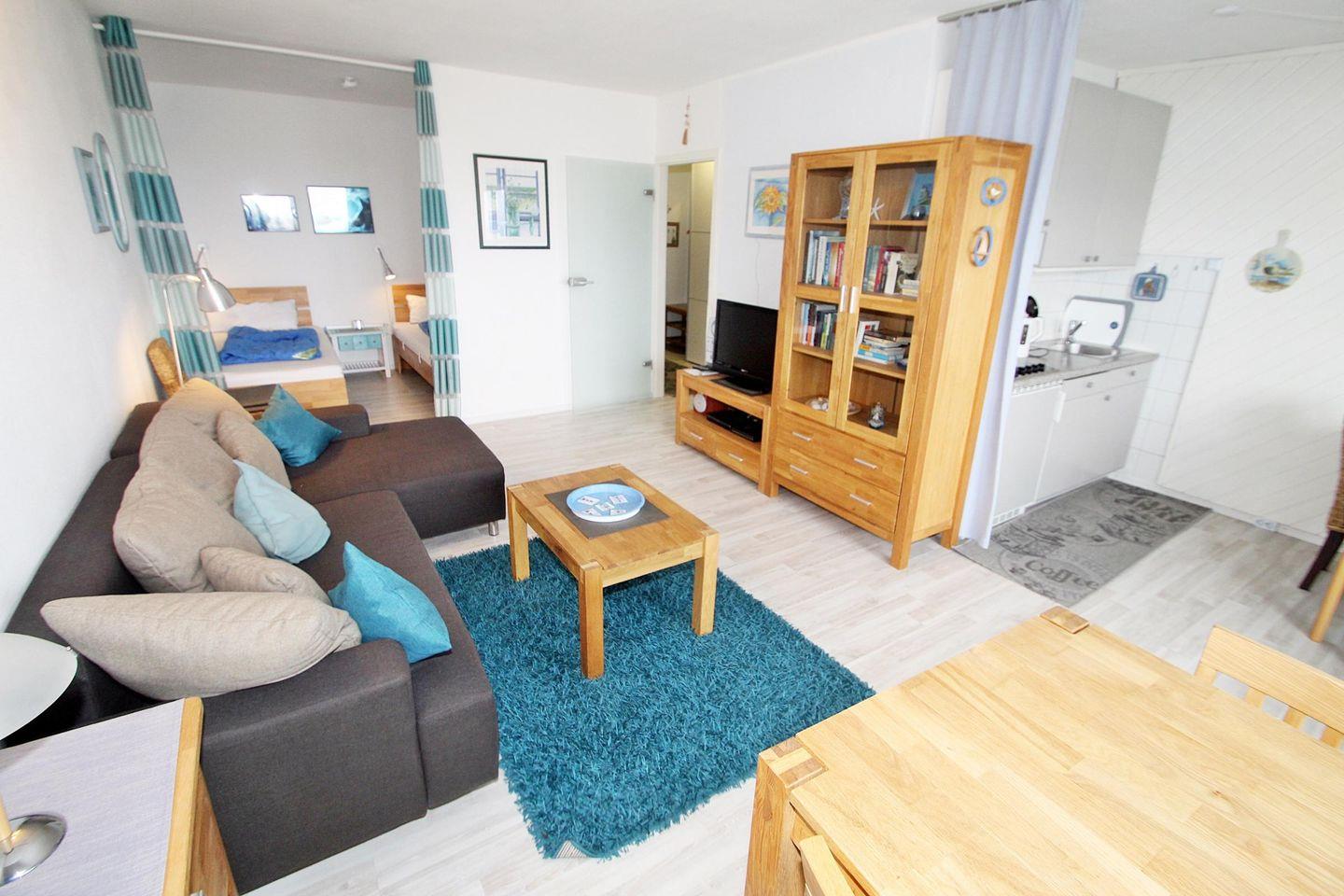 Der großzügige Wohnraum ist mit einer Eck-Couch ( incl. Schlaffunktion für 1 Erw. Person oder 2 Kinder)sowie LCD-TV, Blu-Ray-Player