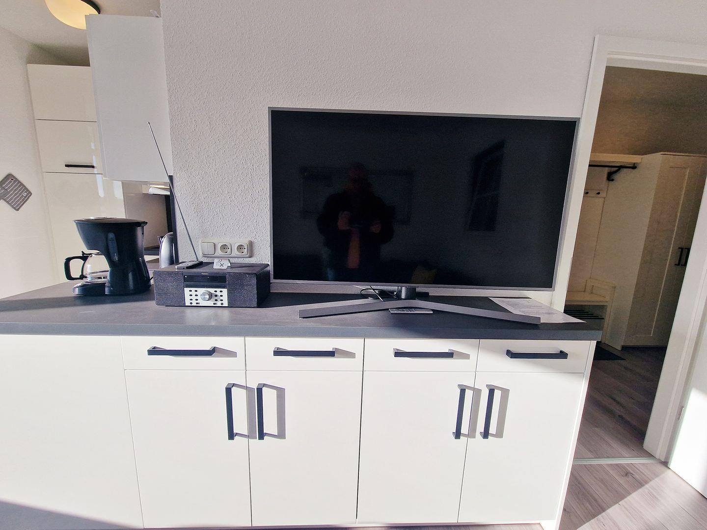 Der gemütliche Wohnbereich lädt mit komfortabler Sitzecke, Essplatz und moderner Unterhaltungstechnik zu entspannten Stunden ein – perfekt für gemeinsame Abende nach einem erlebnisreichen Urlaubstag. Die voll ausgestattete Küche mit Ceranfeld, Geschirrspüler, Kühlschrank mit Gefrierfach, Mikrowelle und Kaffeemaschine bietet alles, was Sie für eine unkomplizierte Selbstversorgung benötigen – ob ausgiebiges Frühstück oder entspanntes Abendessen.
