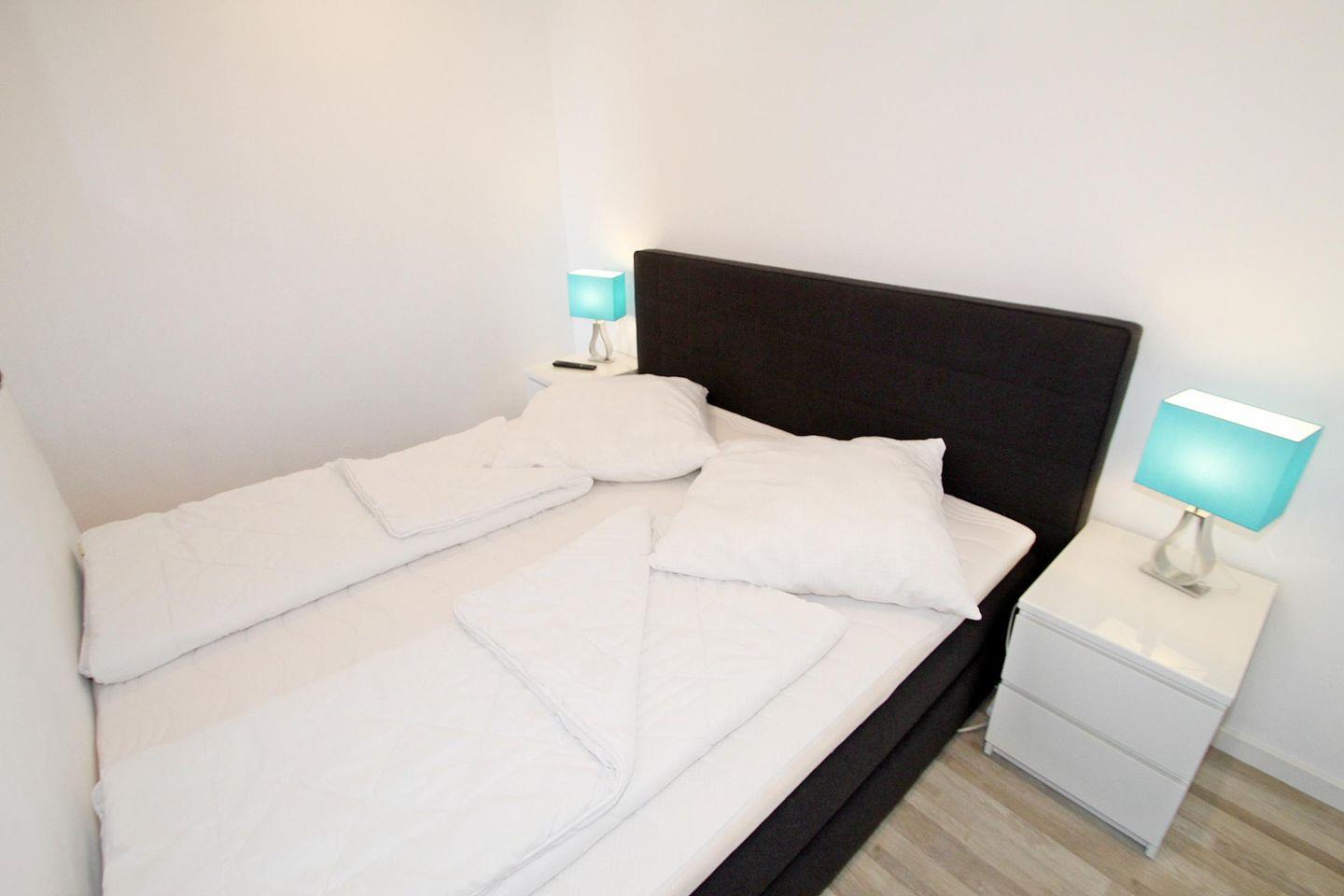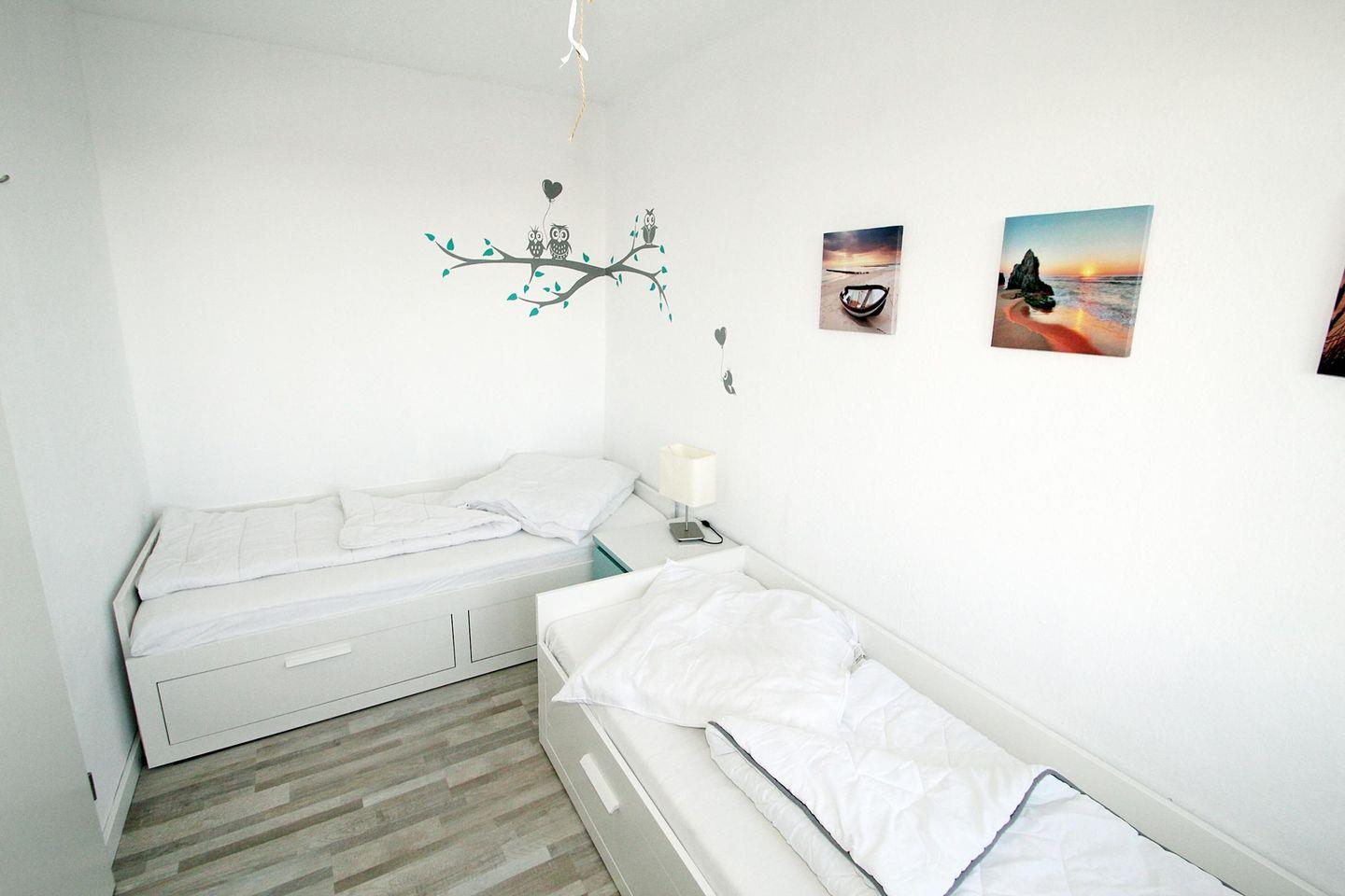 Der Schlafbereich mit einem Doppelbett (180?×?200?cm, bestehend aus zwei je 90?cm breiten Matratzen) ist durch eine Wand vom Wohnraum abgetrennt. Zusätzlich bietet ein separater Raum mit zwei Einzelbetten flexible Schlafmöglichkeiten für Kinder oder weitere Gäste.