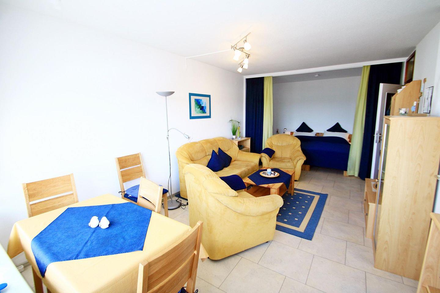 Kombinierter Wohn-Schlafbereich mit einer 3er Couch, 2 Sessel, TV.