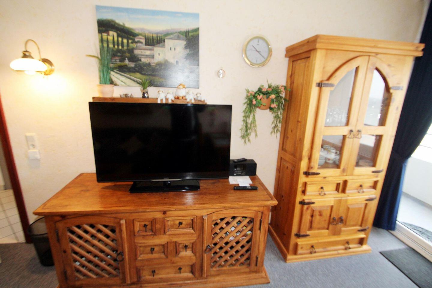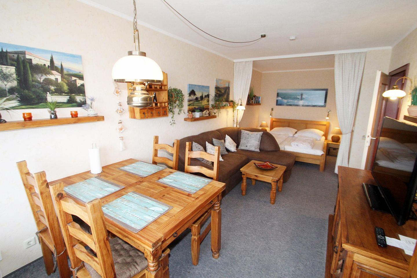 Wohnbereich mit 2er Couch u. Sessel, TV/DVD und integrierter Essecke.