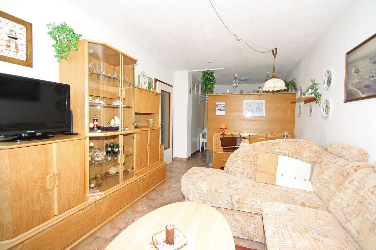 Genießen Sie hier den herrlichen Blick auf den Binnensee. Wohnraum mit einer Eckcouch und TV. Die Essecke befindet sich im hinteren Wohnbereich.