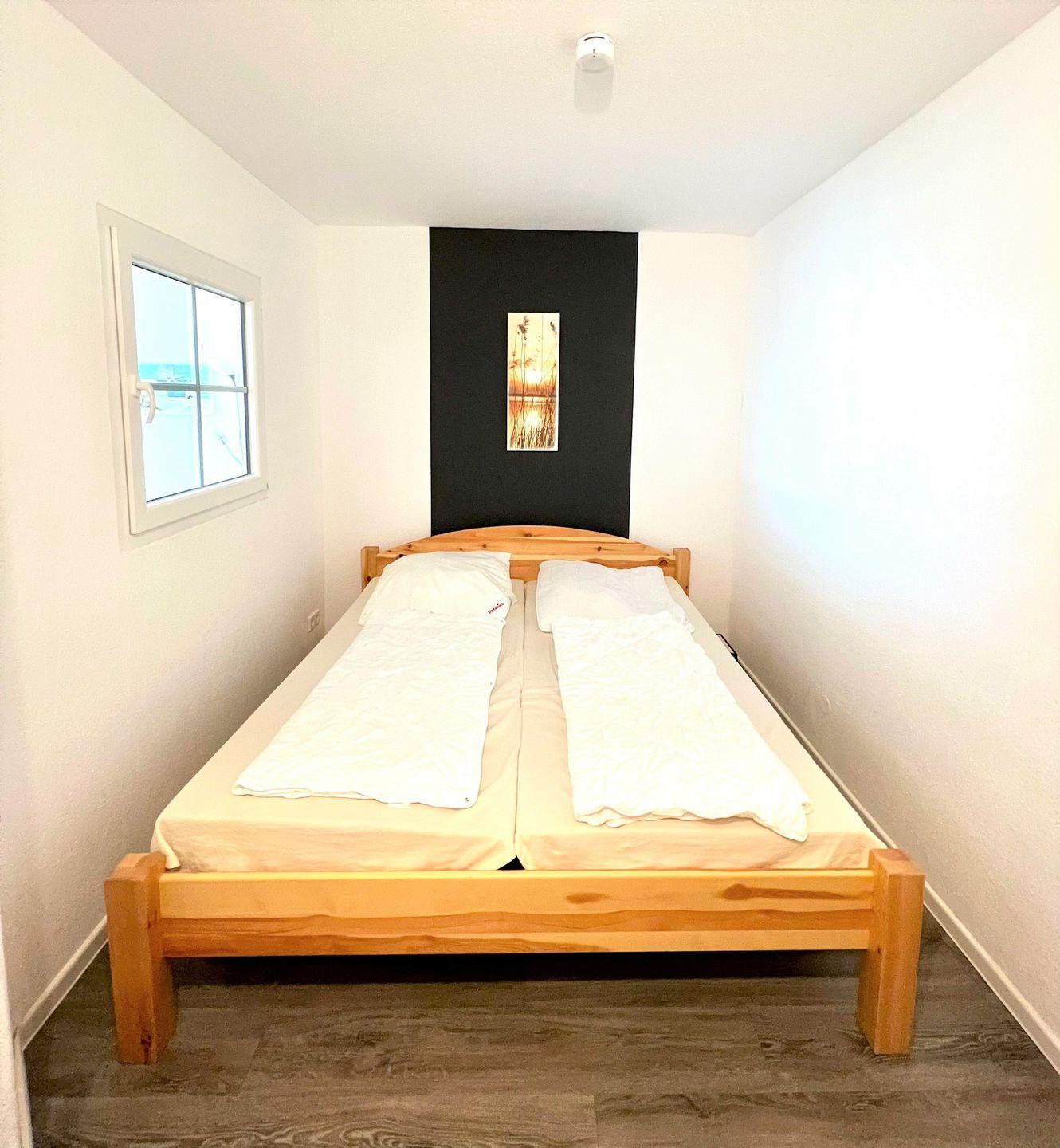 Separates Schlafbereich mit Doppelbett (1,8 x 2,0m) und Plissee zur Verdunklung.