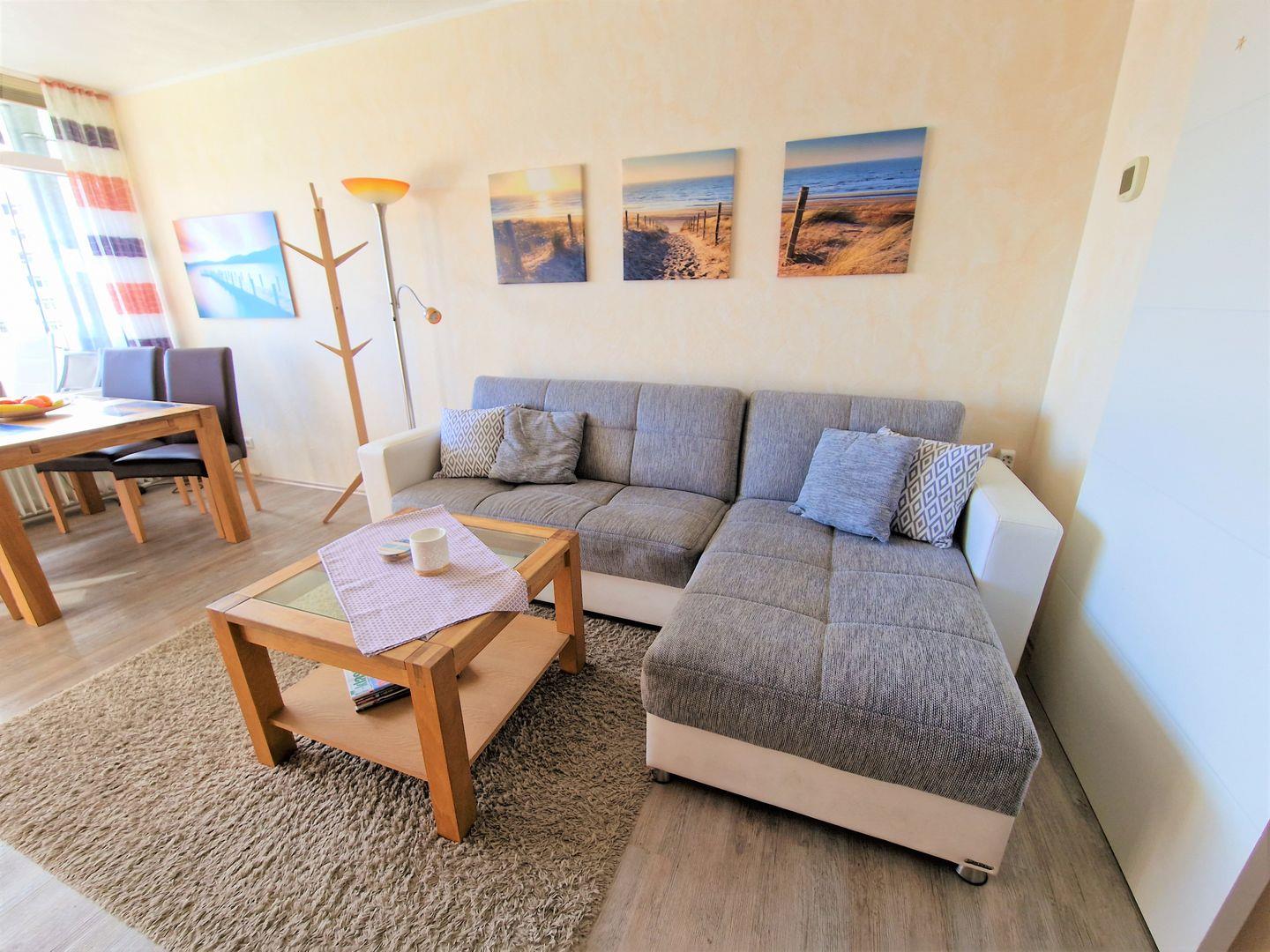 Im Wohnzimmer kann man es sich auf einem Ecksofa gemütlich machen.