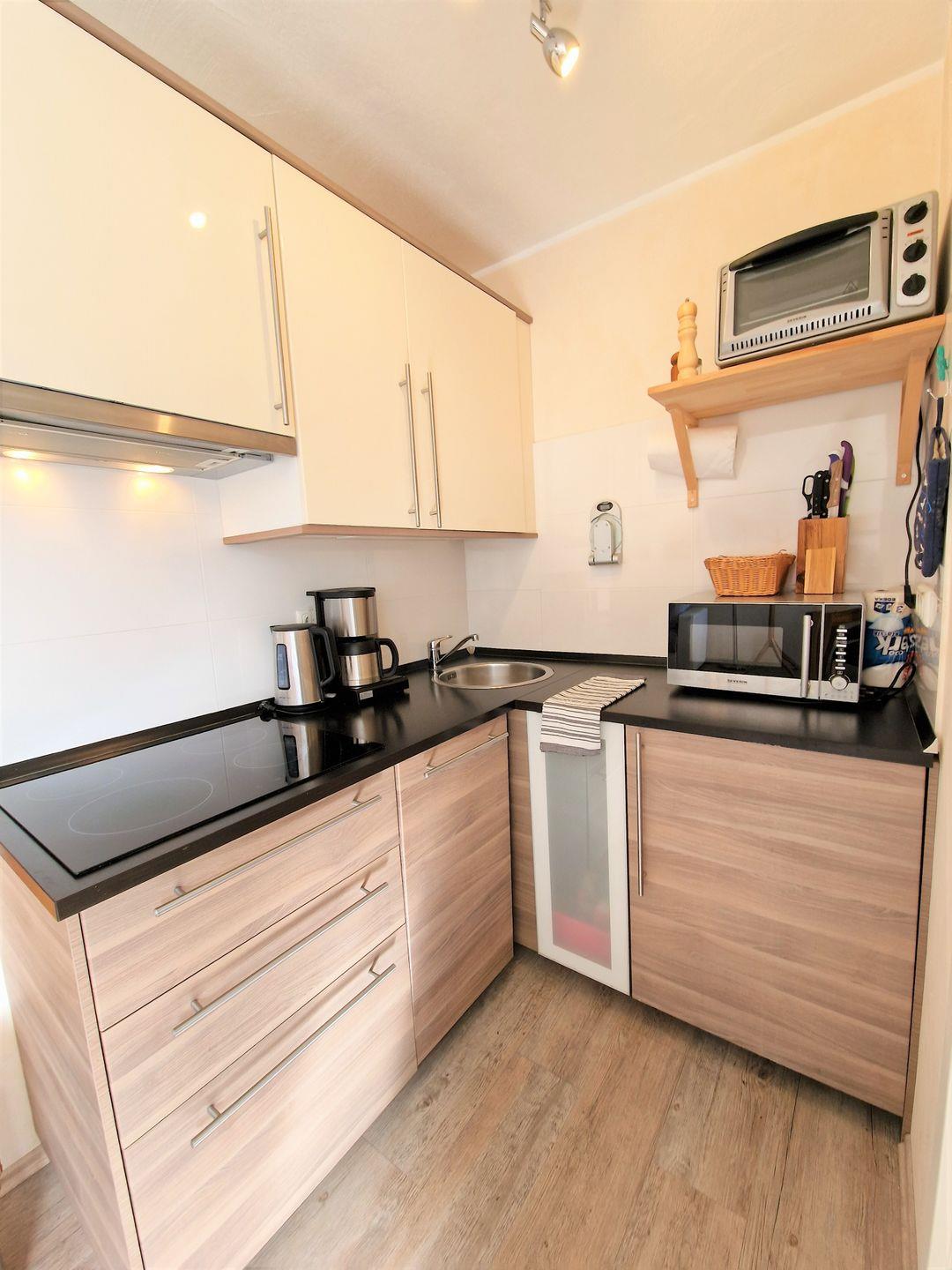 Die neue, integrierte Küche lädt auch mal zum kulinarischen Genuss zu Hause ein und ist mit einer Spülmaschine und einem Kombigerät ausgestattet.