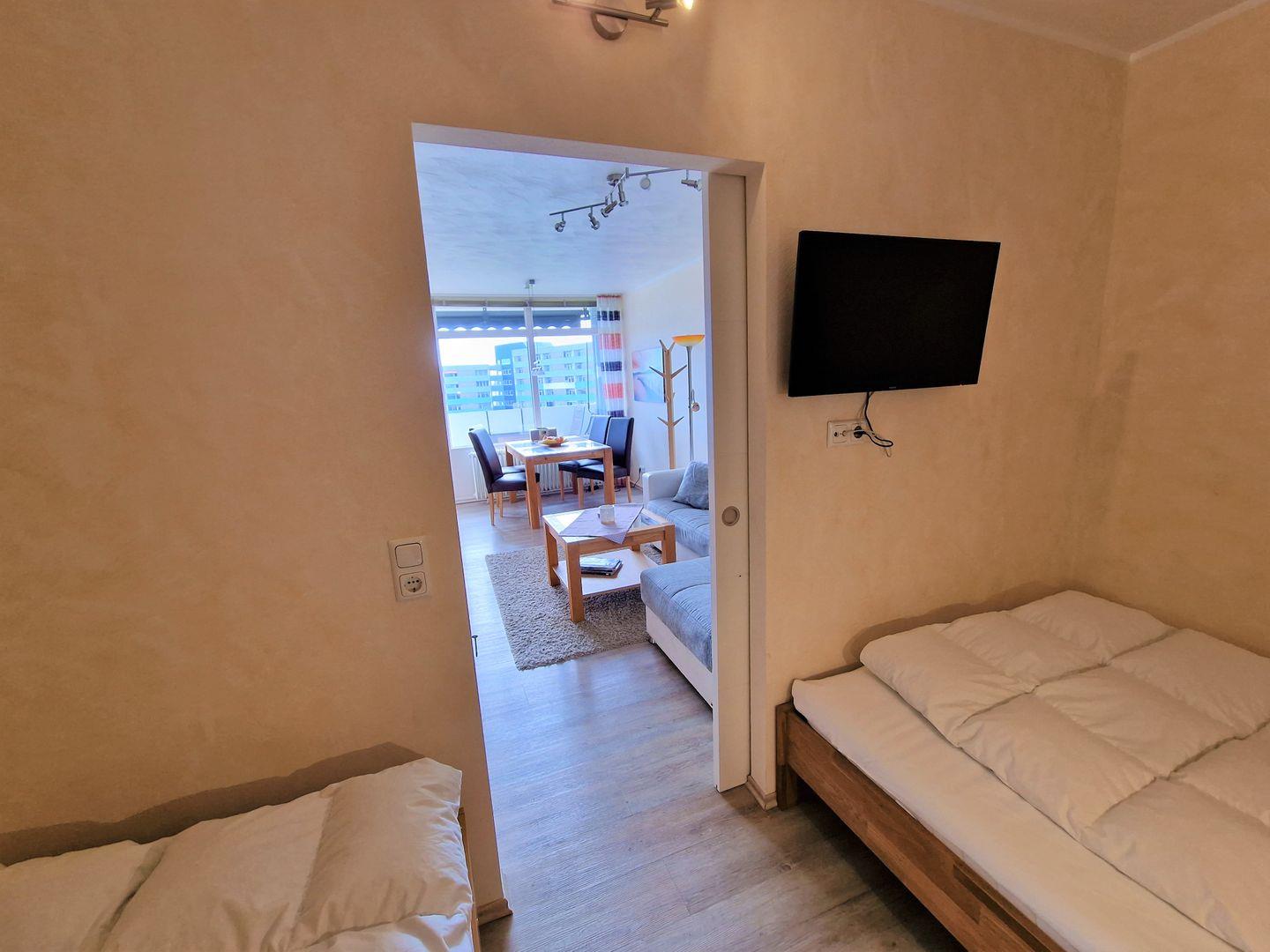 Das Schlafzimmer verfügt über 2 Einzelbetten (90x200cm und 140x200cm) und lässt sich mittels einer Schiebetür vom Wohnbereich separieren. Ebenfalls hängt dort ein LCD-TV.