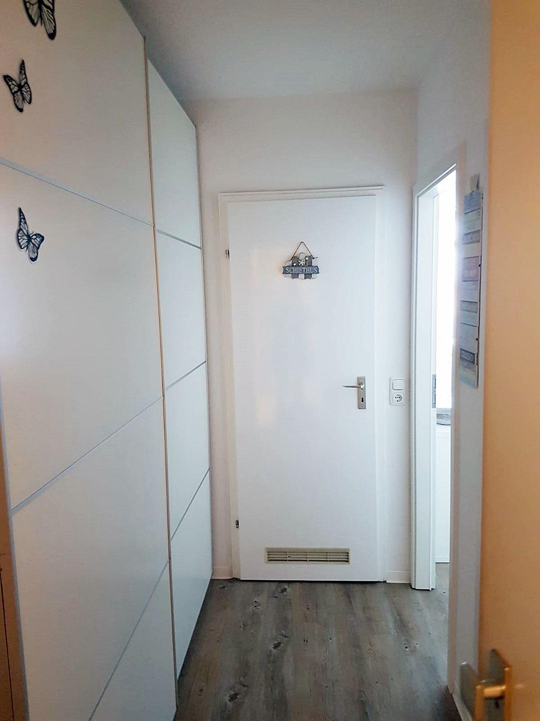 Neu renovierte, helle und schöne Ferienwohnung in der 4. Etage mit neuem Designboden, Süd-Westbalkon und Blick über die weiten Wiesen Heiligenhafens sowie etwas Ostseeblick.