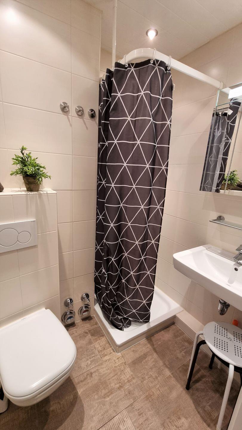 Sehr schickes, modern renoviertes Bad mit Dusche und neuem Wand-WC.