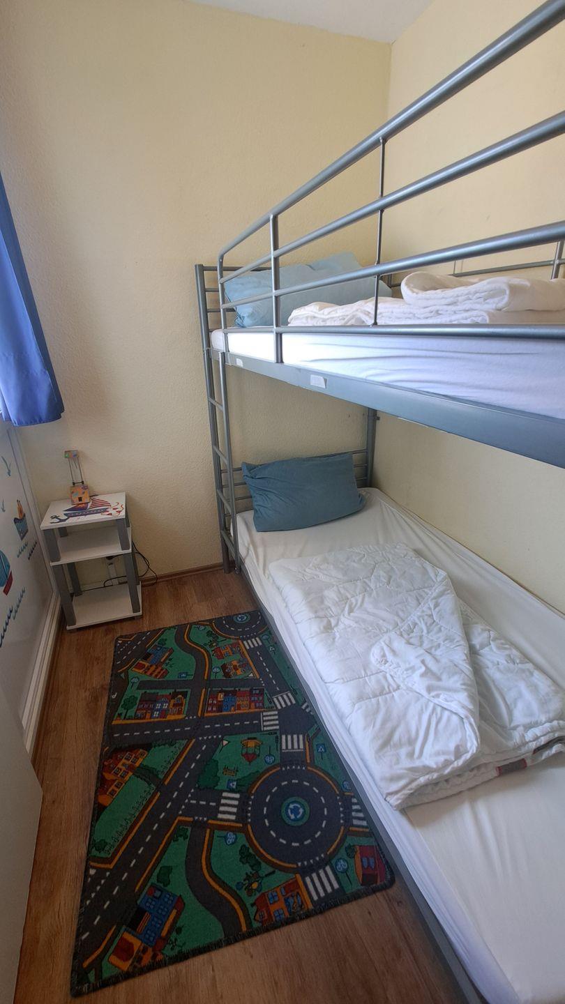 Kinderzimmer mit Tür (und Fenster zumÖffnen) und Etagenbett.