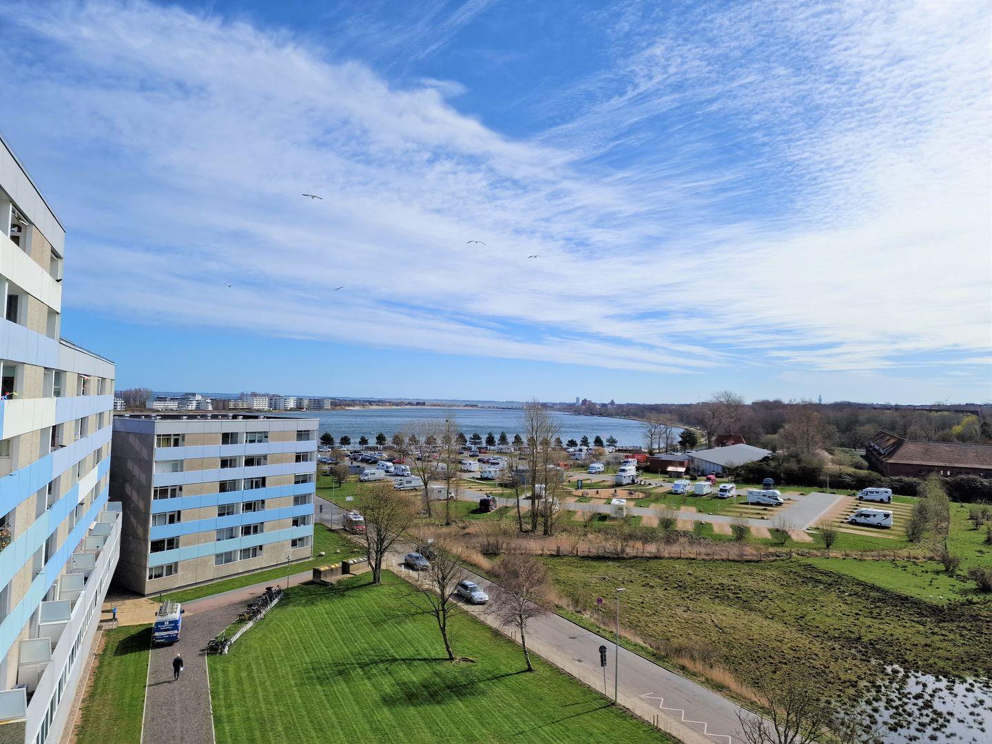 Auf dem Balkon zur Ostseite sind Sitzgelegenheiten vorhanden. Von hier aus haben Sie einen schönen Blick über den Binnensee in Richtung Yachthafen.