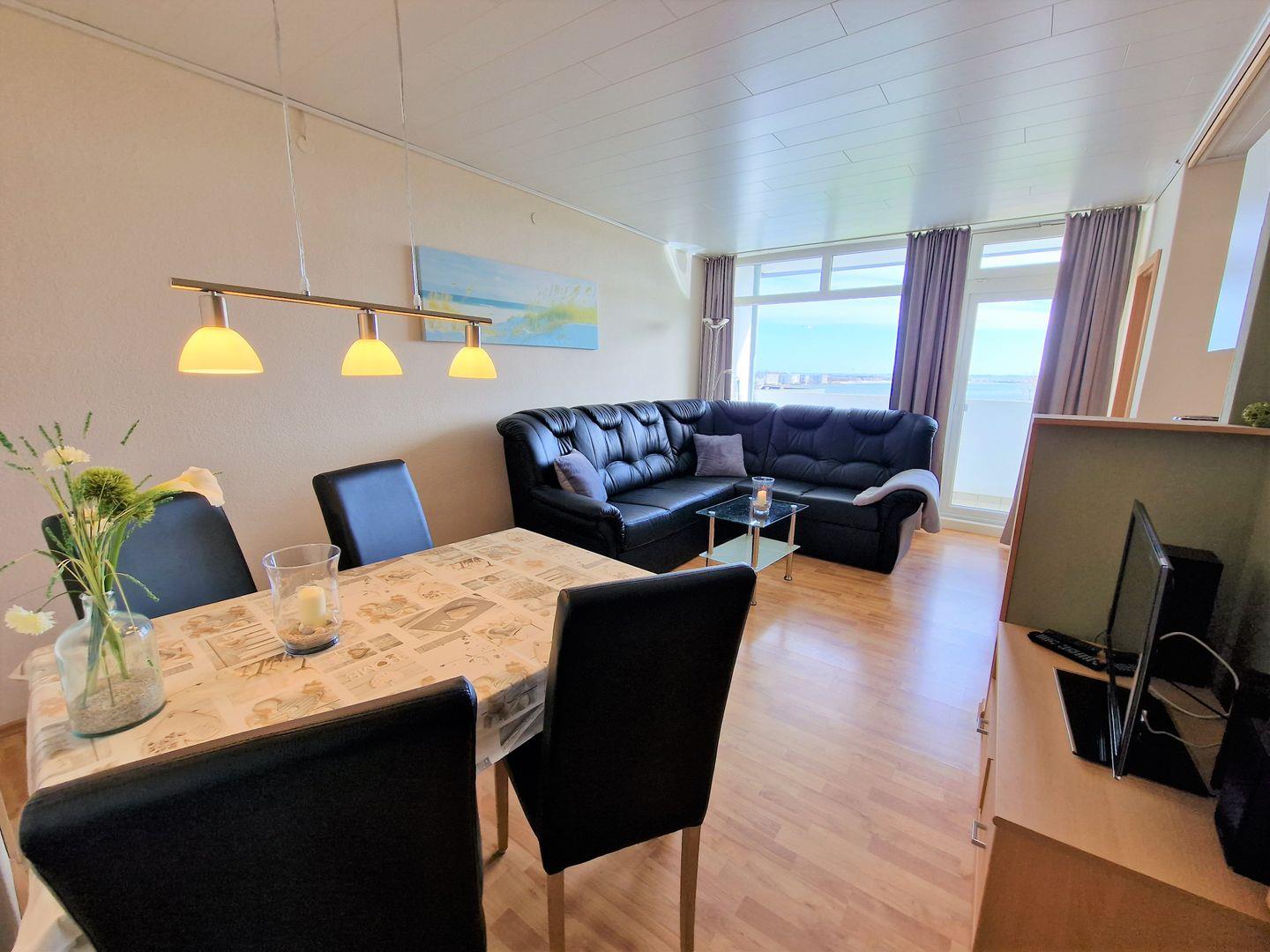 Im Wohnbereich befindet sich eine gemütliche und große Couchgarnitur, ein Flachbild-TV sowie eien gemütliche Essecke.