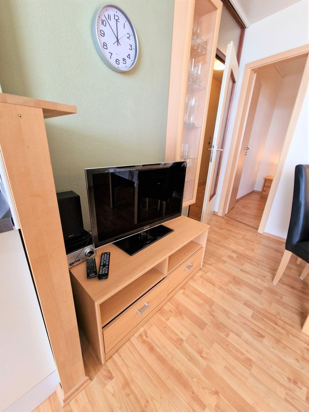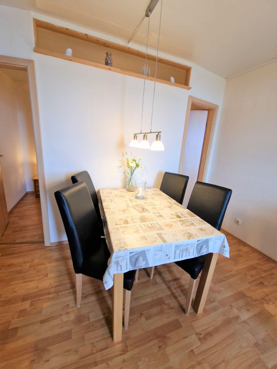 Moderne Ferienwohnung mit Wohn- Schlaf- und Kinderzimmer. Die gesamte Wohnung ist mit Laminat ausgelegt.