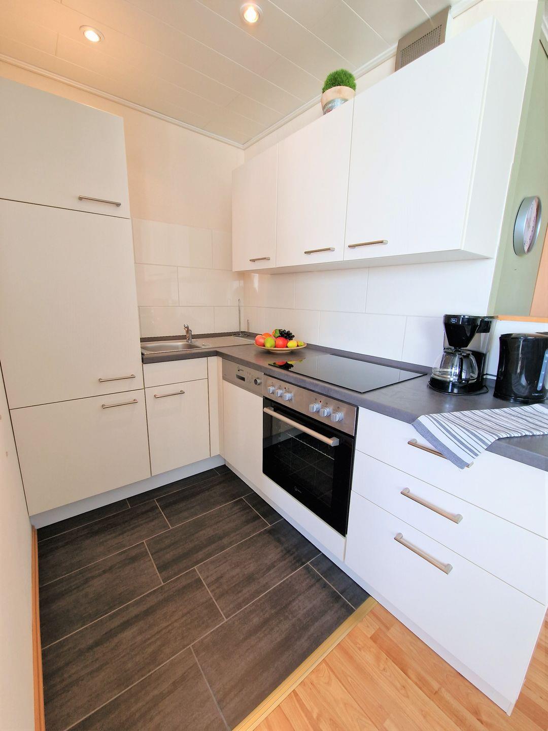 Die neue Küche ist offen gestaltet und mit Backofen, einem 4er-Ceranfeld, einem großen Kühlschrank mit Gefrierfach sowie einer Kaffeemaschine ausgestattet.