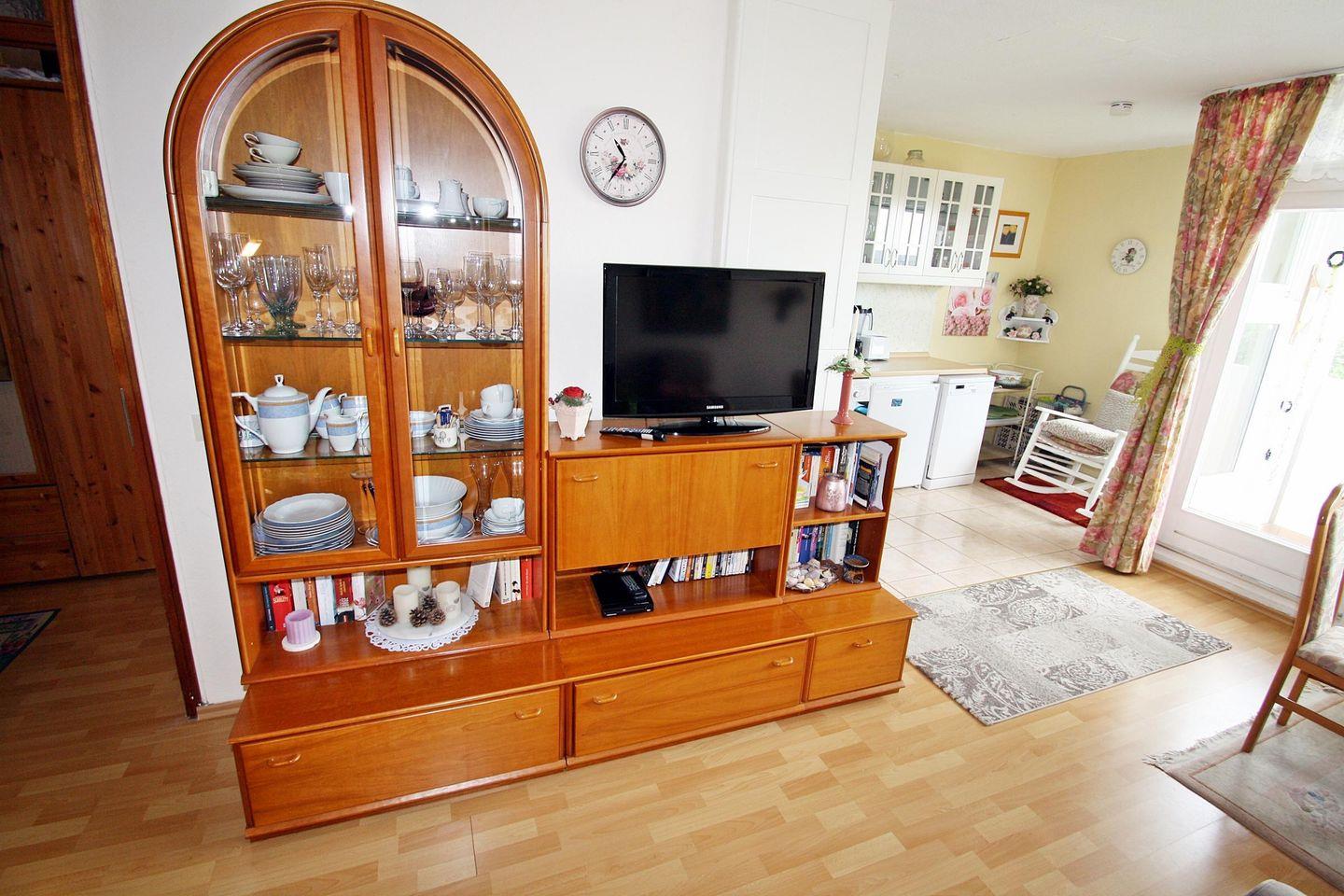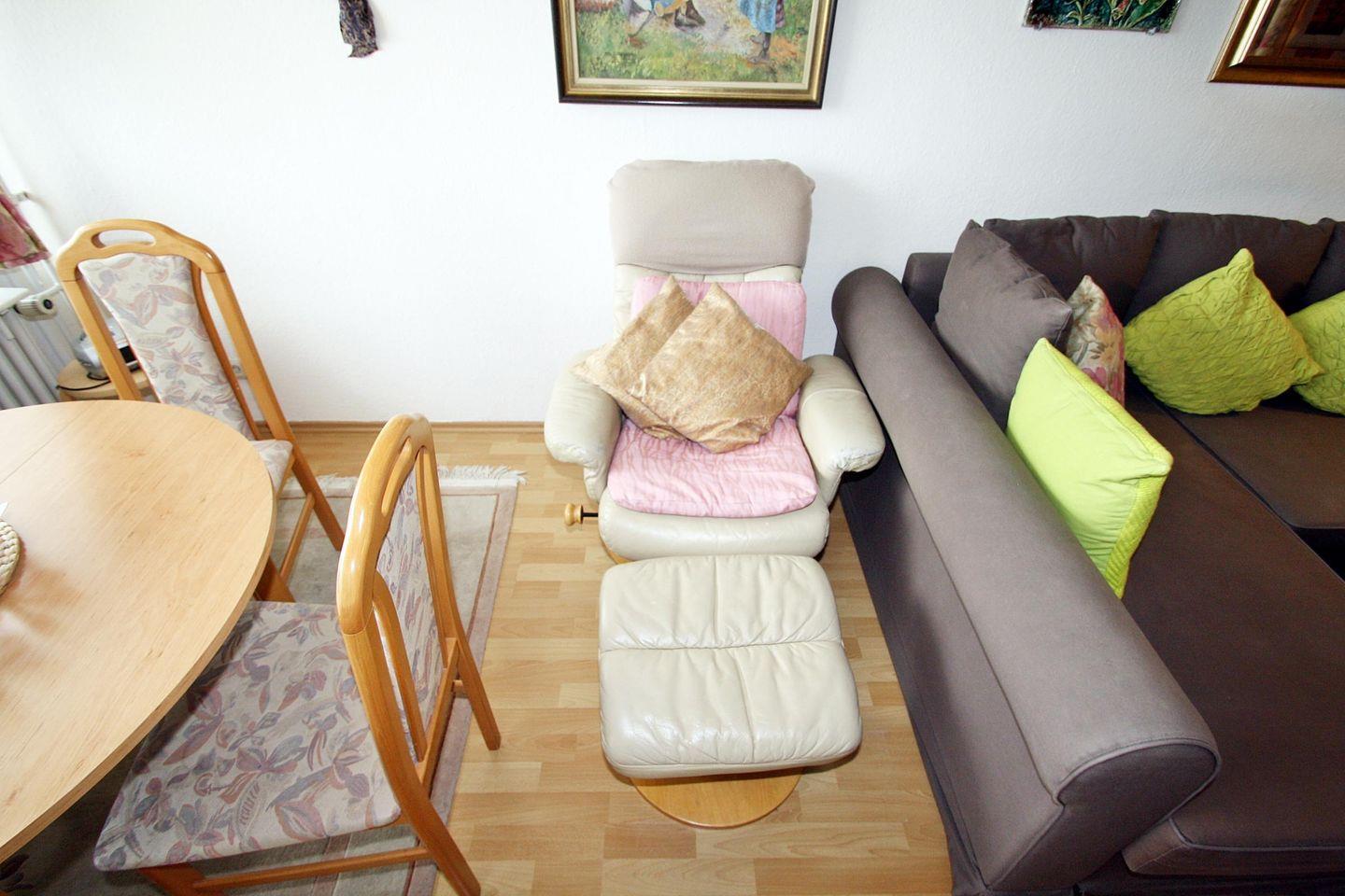 Der Wohnbereich ist mit einer Schlafcouch (evtl. für 3. Person oder zwei Kinder) und einem Relaxsessel, Flach-TV, DVD, Laminat und einer Essecke - die sich direkt am Fenster befindet - ausgestattet.