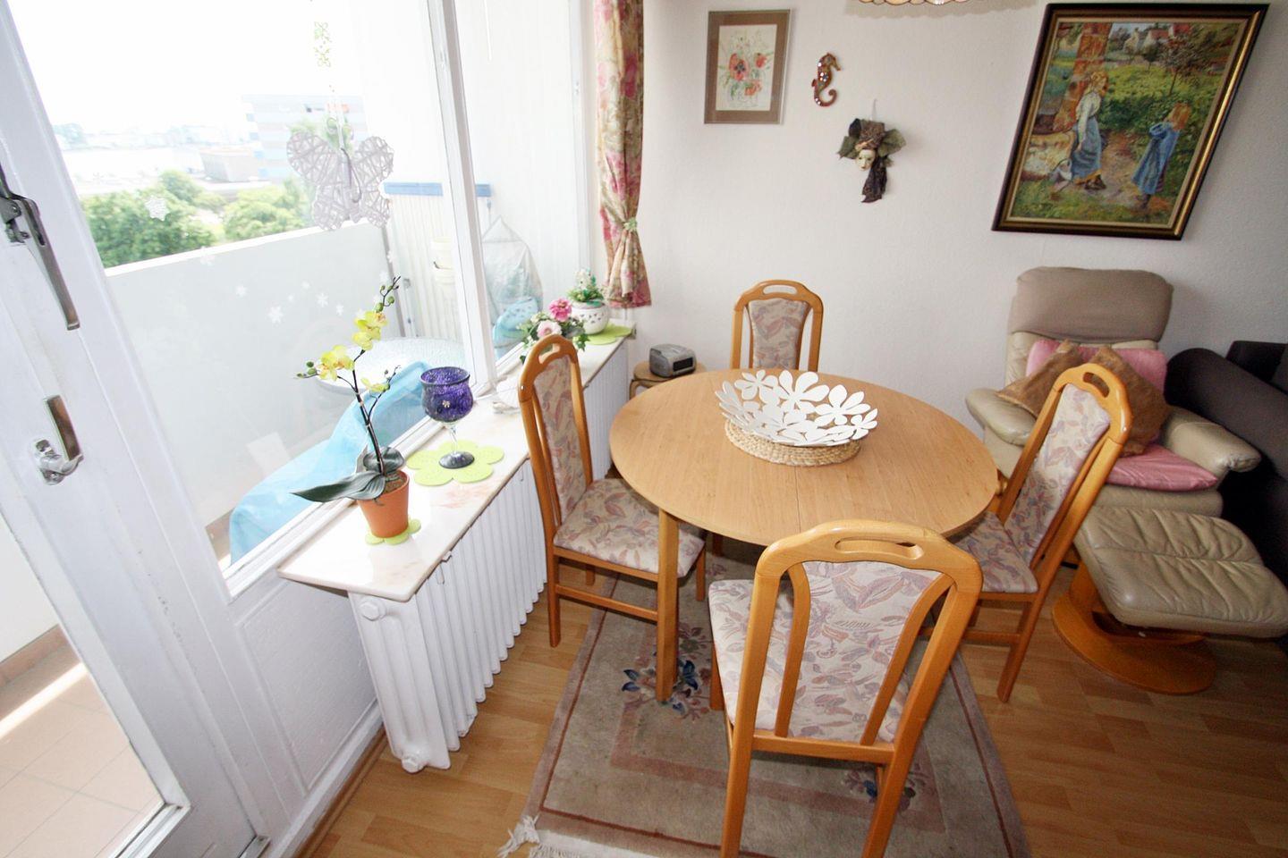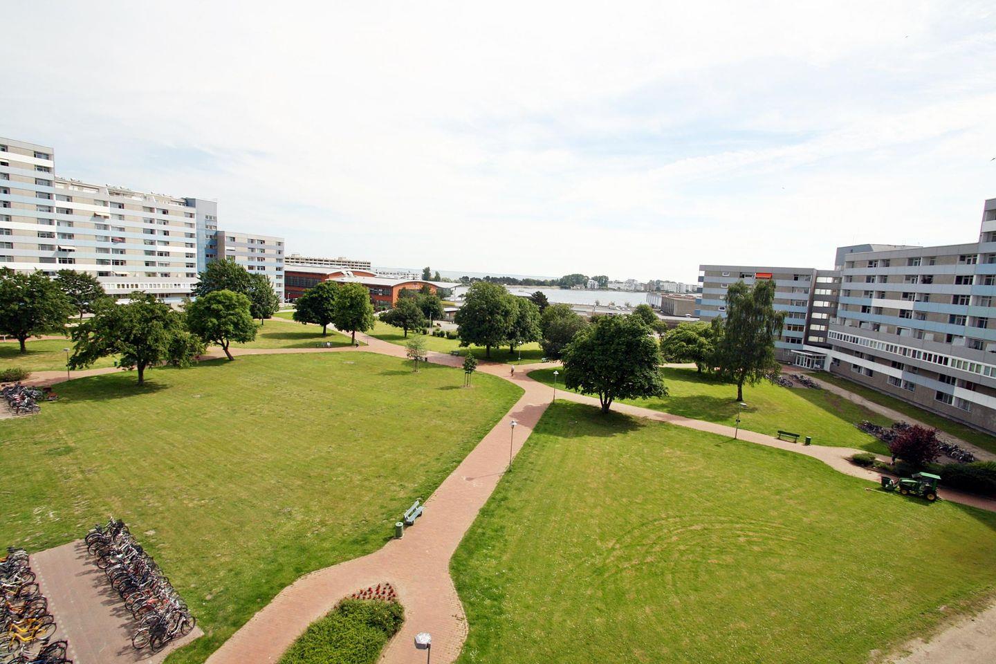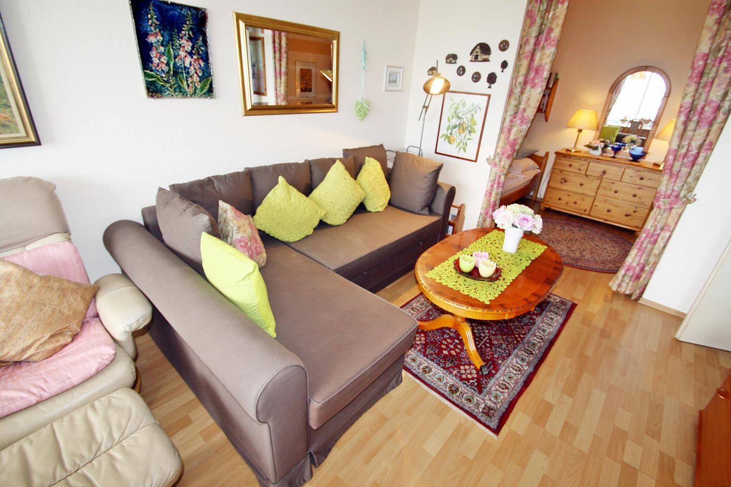 Gemütliche und gepflegte Wohnung mit Balkon für 4 Personen (Schlafcouch für 2 im Wohnbereich). Blick über die Innenhof-Parkanlage in Richtung Ostsee.