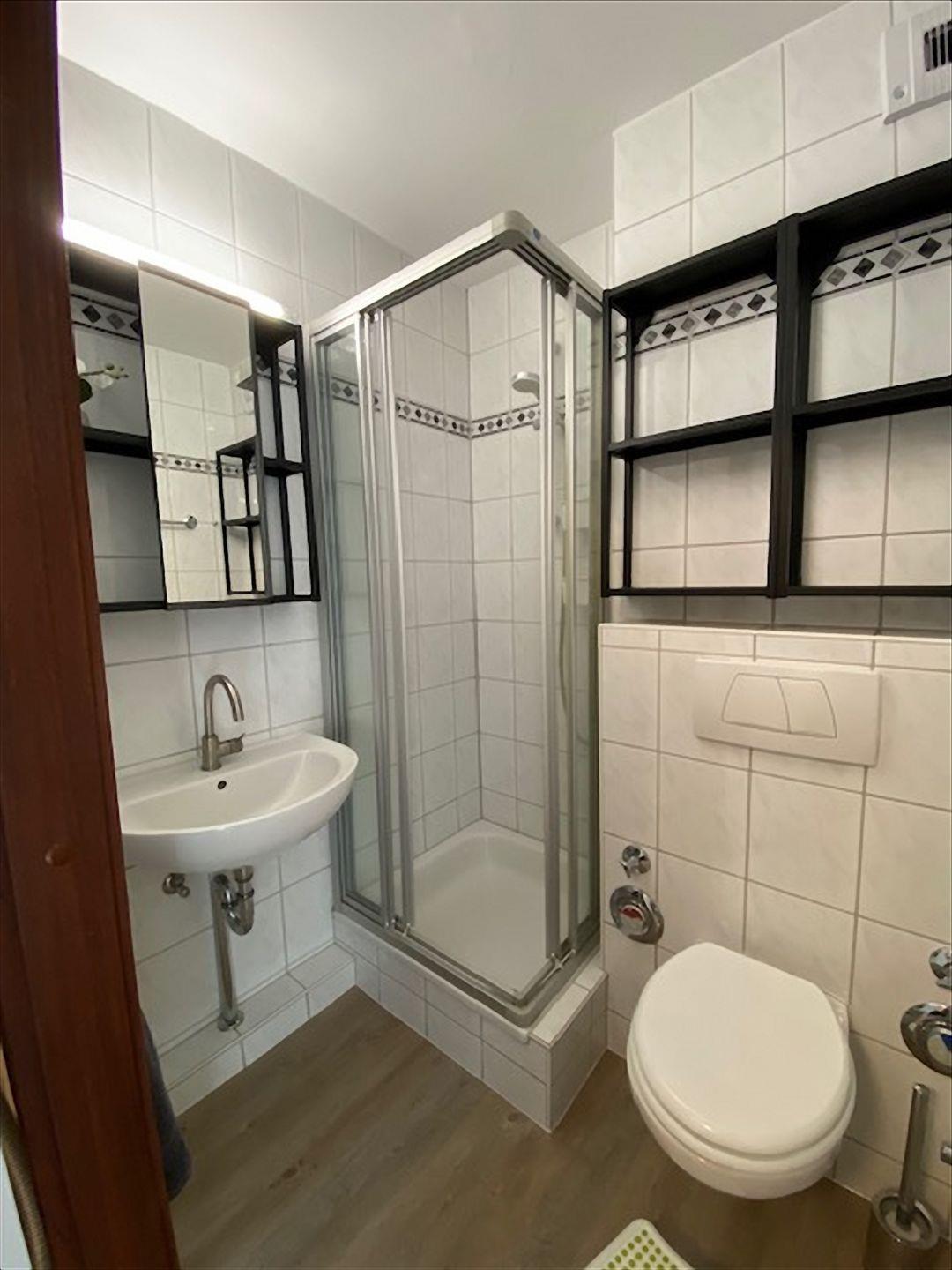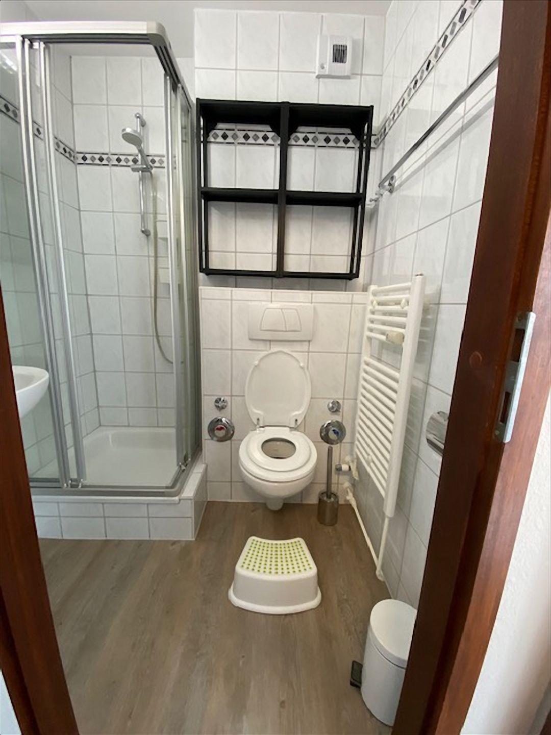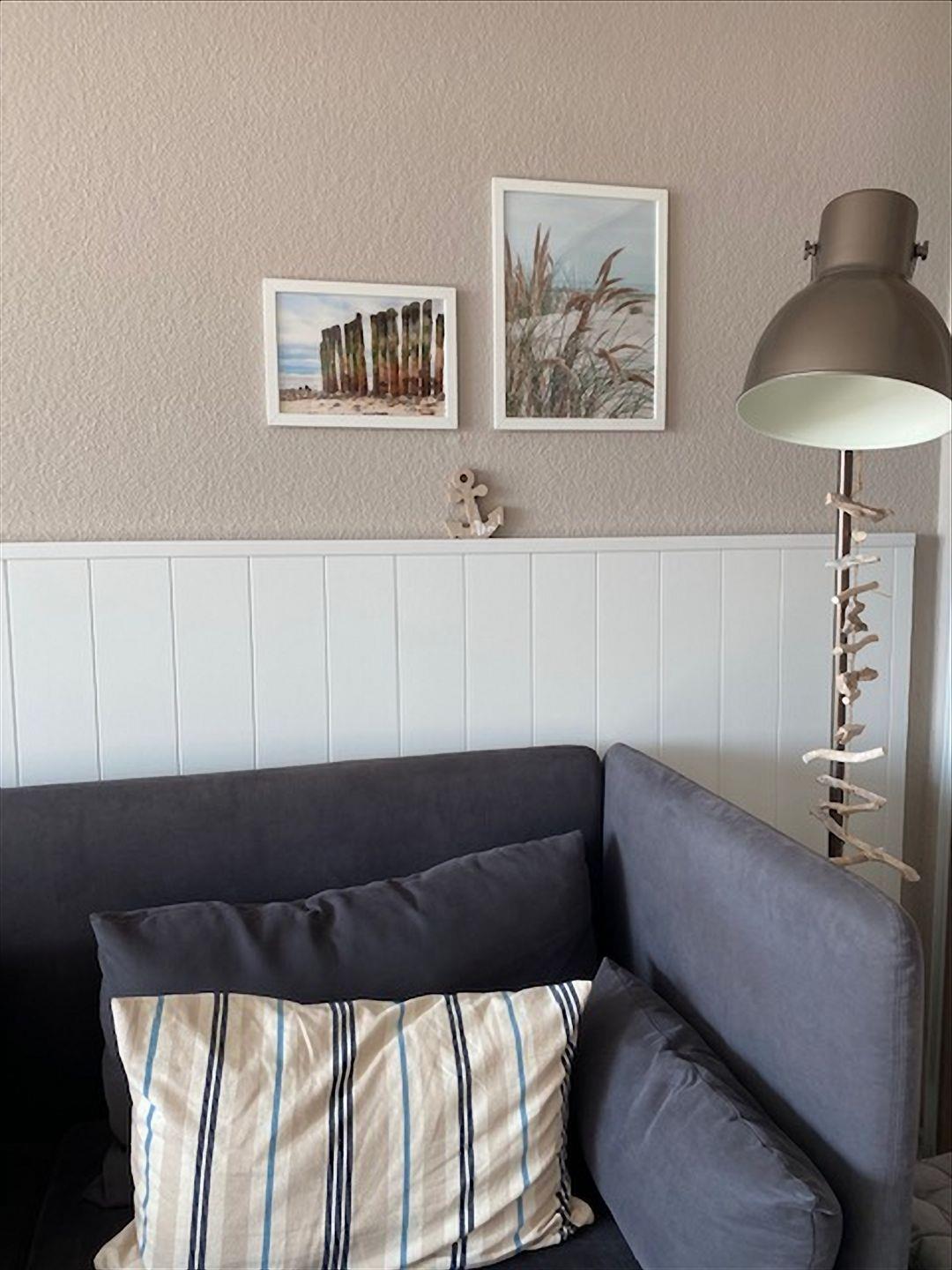 Der Wohnraum ist mit einem dunklen 2-Sitzer, einer hellen Kommode und Hängeregal aus Holz sowie einem 80er-Flachbild-TV und DVD-Player, einer Musikanlage mit Radio und CD-Player ausgestattet. Selbstverständlich ist WLAN kostenlos für normales Surfen vorhanden (bitte beachten Sie, dass Streaming aufgrund begrenztem Datenvolumen nicht möglich ist).